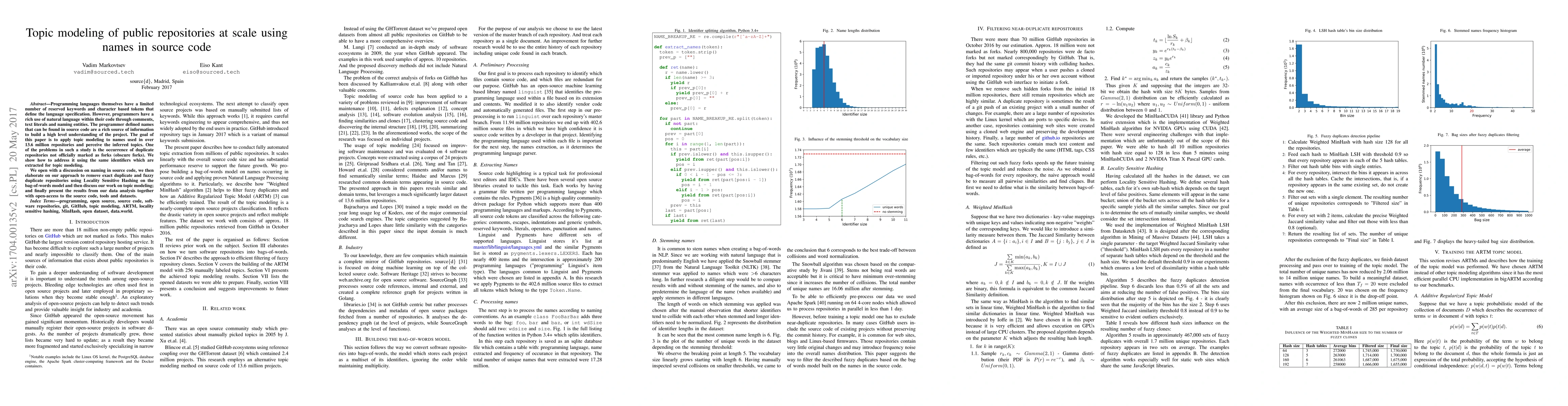 This paper explores topic modeling of over 13.6 million public repositories using programmer-defined names in source code to infer high-level project understanding. It addresses the issue of duplicate repositories using Locality Sensitive Hashing and presents results from the analysis, offering open-access tools and datasets.