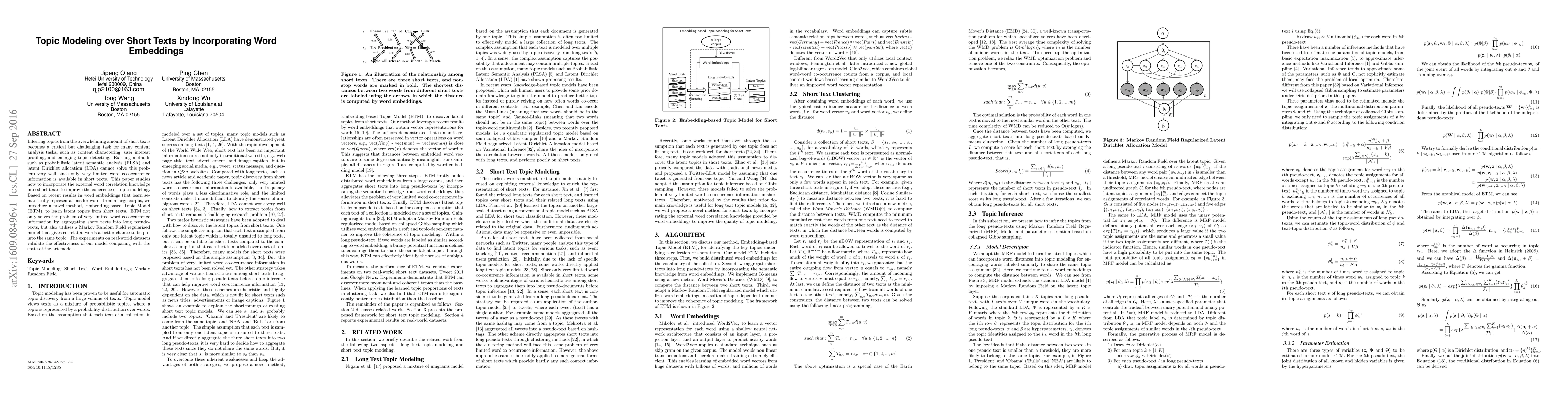 Inferring topics from the overwhelming amount of short texts becomes a critical but challenging task for many content analysis tasks, such as content charactering, user interest profiling, and emerging topic detecting. Existing methods such as probabilistic latent semantic analysis (PLSA) and latent Dirichlet allocation (LDA) cannot solve this prob- lem very well since only very limited word co-occurrence information is available in short texts. This paper studies how to incorporate the external word correlation knowledge into short texts to improve the coherence of topic modeling. Based on recent results in word embeddings that learn se- mantically representations for words from a large corpus, we introduce a novel method, Embedding-based Topic Model (ETM), to learn latent topics from short texts. ETM not only solves the problem of very limited word co-occurrence information by aggregating short texts into long pseudo- texts, but also utilizes a Markov Random Field regularized model that gives correlated words a better chance to be put into the same topic. The experiments on real-world datasets validate the effectiveness of our model comparing with the state-of-the-art models.