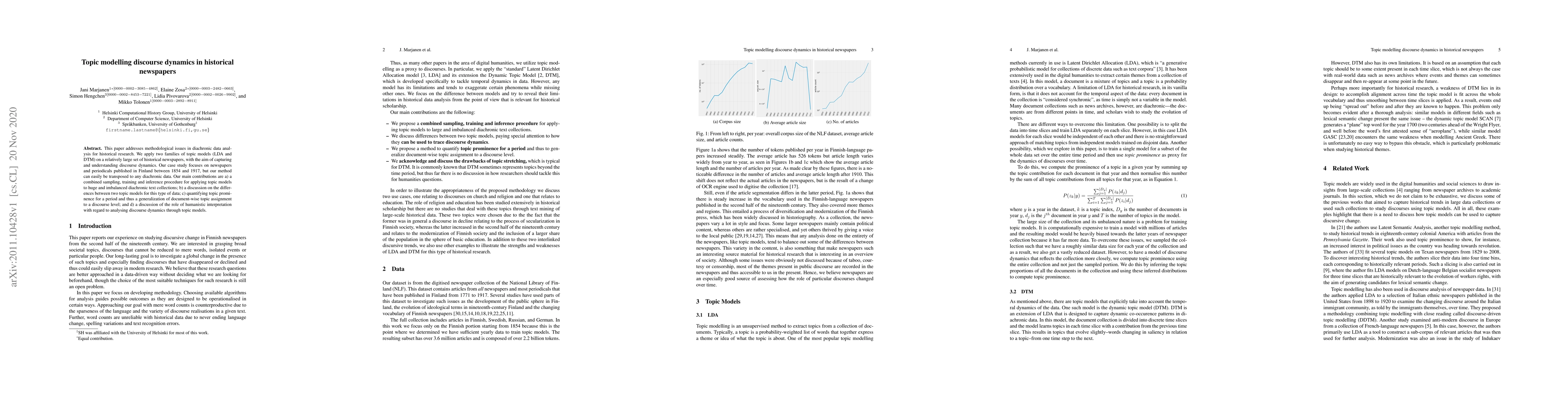 This paper develops a combined procedure for applying topic models to large, imbalanced historical newspaper collections, comparing LDA and DTM to analyze discourse dynamics from 1854 to 1917 in Finland. It also discusses the role of humanistic interpretation in interpreting the results.