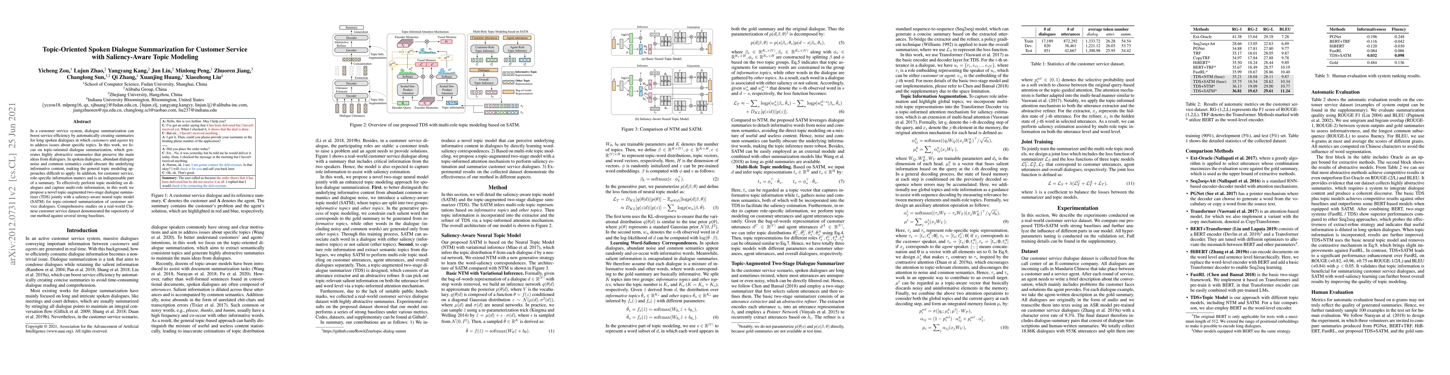 This paper proposes a novel topic-augmented two-stage dialogue summarizer (TDS) combined with a saliency-aware neural topic model (SATM) to enhance topic-oriented summarization in customer service dialogues. The method effectively captures multi-role information and outperforms baselines on a real-world Chinese dataset.