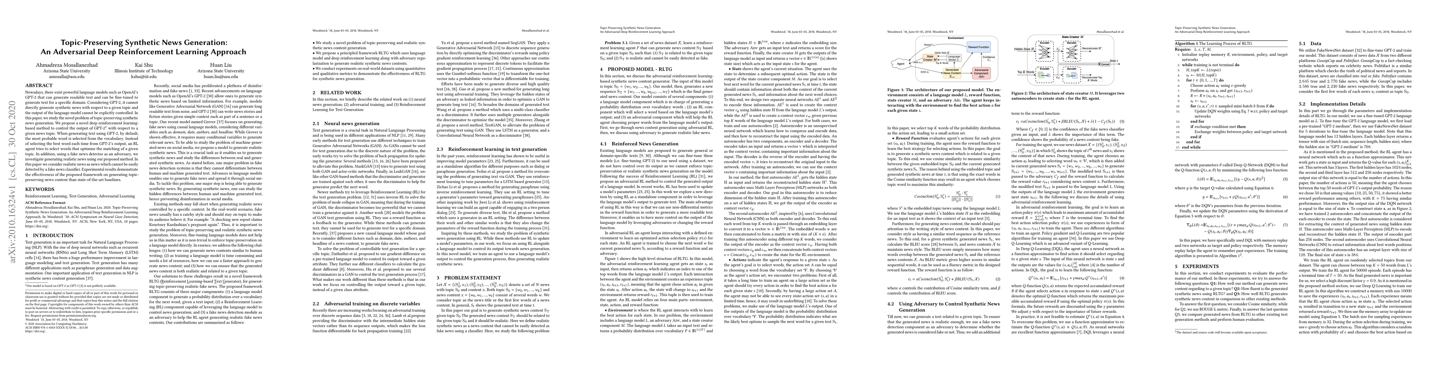 Nowadays, there exist powerful language models such as OpenAI's GPT-2 that can generate readable text and can be fine-tuned to generate text for a specific domain. Considering GPT-2, it cannot directly generate synthetic news with respect to a given topic and the output of the language model cannot be explicitly controlled. In this paper, we study the novel problem of topic-preserving synthetic news generation. We propose a novel deep reinforcement learning-based method to control the output of GPT-2 with respect to a given news topic. When generating text using GPT-2, by default, the most probable word is selected from the vocabulary. Instead of selecting the best word each time from GPT-2's output, an RL agent tries to select words that optimize the matching of a given topic. In addition, using a fake news detector as an adversary, we investigate generating realistic news using our proposed method. In this paper, we consider realistic news as news that cannot be easily detected by a fake news classifier. Experimental results demonstrate the effectiveness of the proposed framework on generating topic-preserving news content than state-of-the-art baselines.