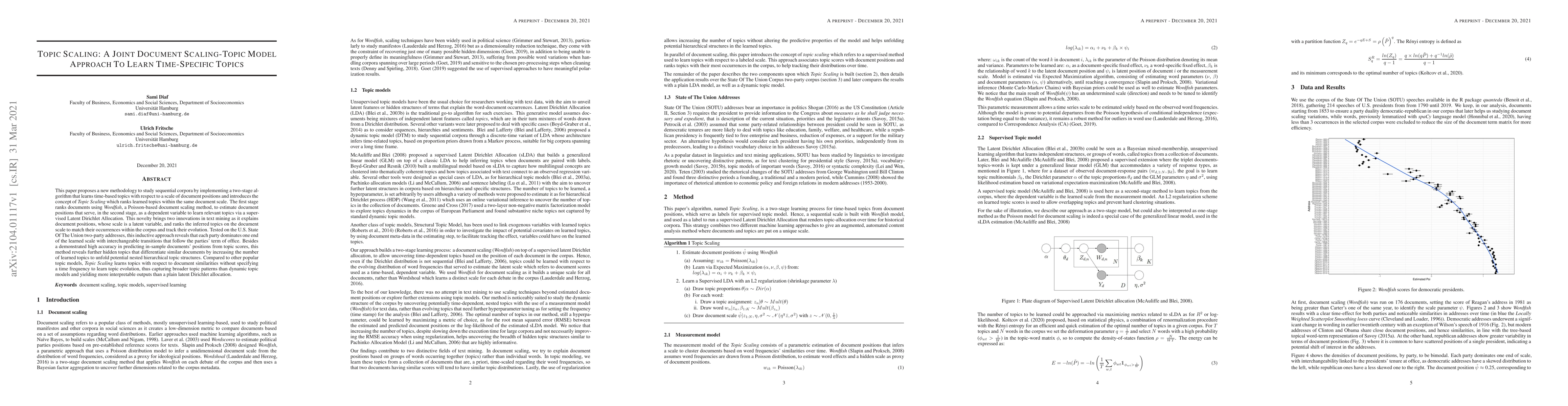 This paper introduces Topic Scaling, a two-stage algorithm that learns time-specific topics in sequential corpora by ranking documents and inferring topics based on document positions, revealing hierarchical topic structures and capturing broader topic patterns compared to dynamic topic models.