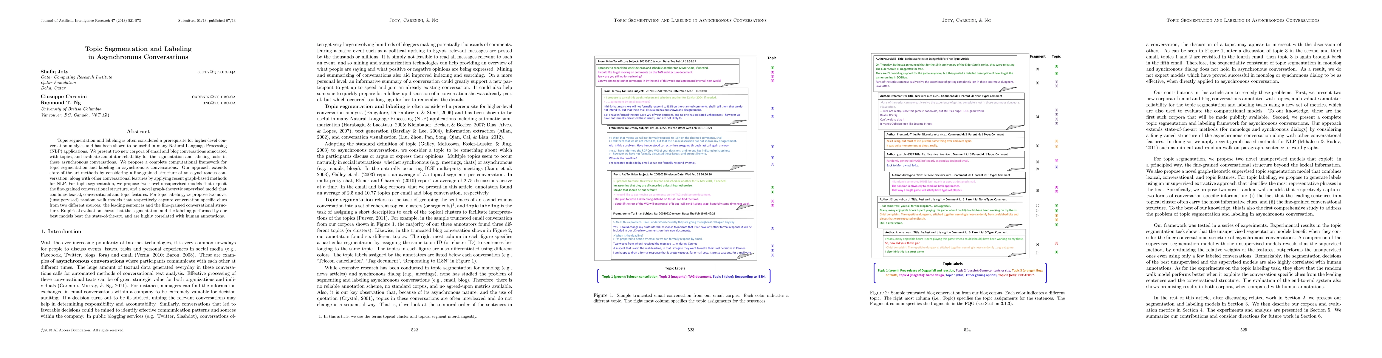 This paper introduces two annotated corpora of email and blog conversations with topic segmentation and labeling, evaluates annotator reliability, and proposes a new computational framework for these tasks. The framework includes novel unsupervised and supervised models for segmentation and random walk models for labeling, outperforming state-of-the-art methods and correlating well with human annotations.