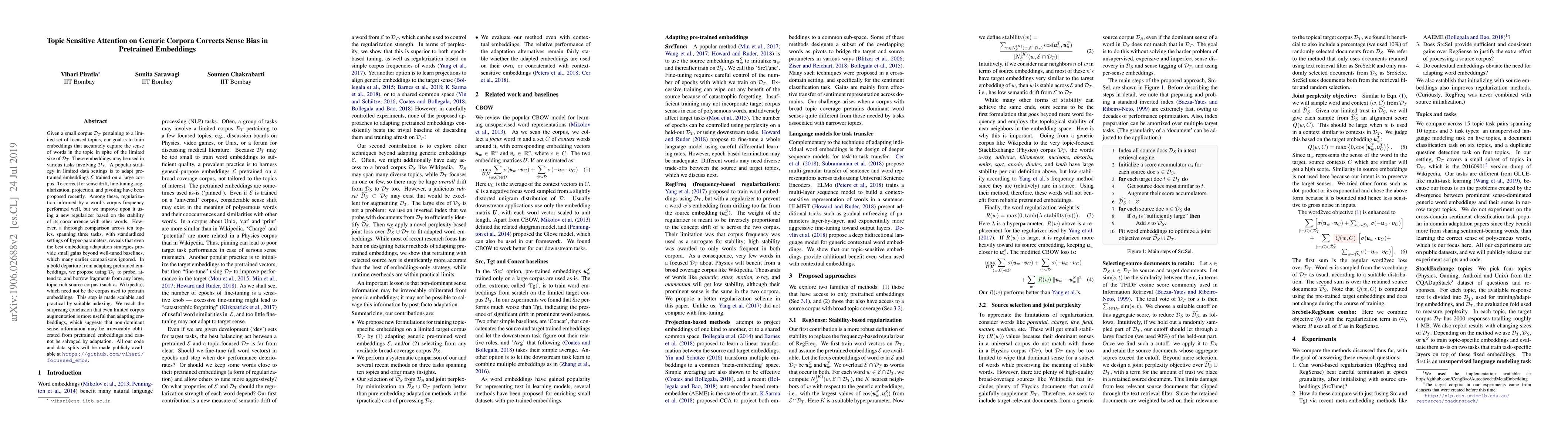 This paper proposes a method to train embeddings that accurately capture the sense of words in a topic-specific small corpus by using topic-sensitive attention on generic corpora, rather than adapting pre-trained embeddings. It finds that augmenting the limited corpus with fragments from a large, topic-rich source corpus yields better results than embedding adaptation, suggesting that non-dominant sense information in pre-trained embeddings cannot be salvaged.