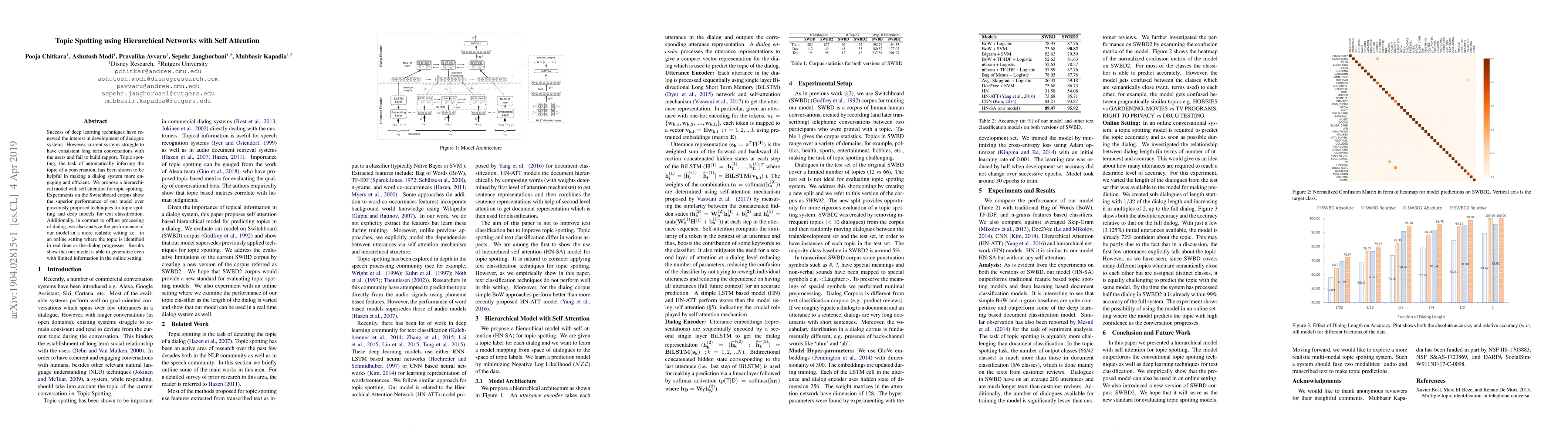 This paper proposes a hierarchical network with self-attention for topic spotting in dialogue systems, demonstrating superior performance over existing methods on the Switchboard corpus. The model effectively generalizes in real-time online settings, enhancing the system's ability to maintain engagement and efficiency in long-term conversations.