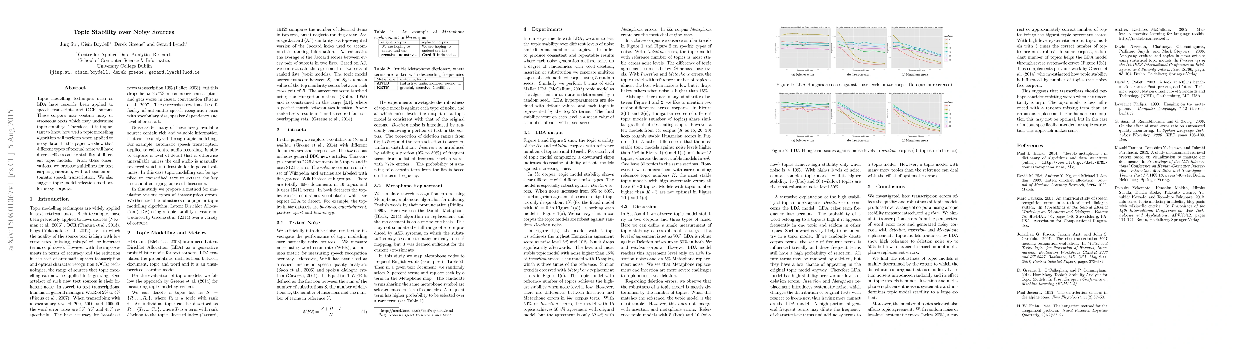 Topic modelling techniques such as LDA have recently been applied to speech transcripts and OCR output. These corpora may contain noisy or erroneous texts which may undermine topic stability. Therefore, it is important to know how well a topic modelling algorithm will perform when applied to noisy data. In this paper we show that different types of textual noise will have diverse effects on the stability of different topic models. From these observations, we propose guidelines for text corpus generation, with a focus on automatic speech transcription. We also suggest topic model selection methods for noisy corpora.