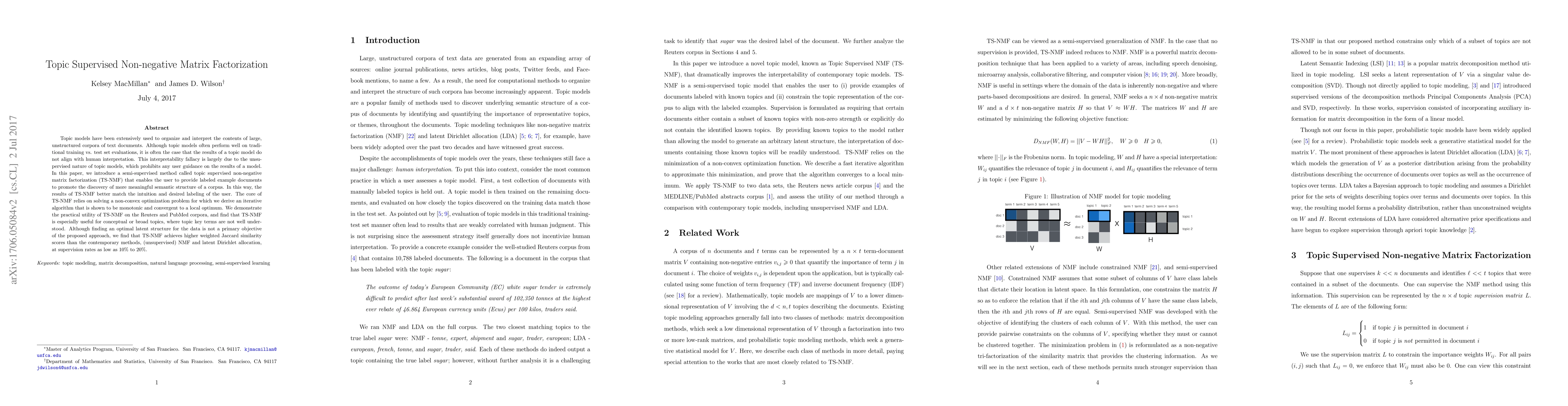Topic models have been extensively used to organize and interpret the contents of large, unstructured corpora of text documents. Although topic models often perform well on traditional training vs. test set evaluations, it is often the case that the results of a topic model do not align with human interpretation. This interpretability fallacy is largely due to the unsupervised nature of topic models, which prohibits any user guidance on the results of a model. In this paper, we introduce a semi-supervised method called topic supervised non-negative matrix factorization (TS-NMF) that enables the user to provide labeled example documents to promote the discovery of more meaningful semantic structure of a corpus. In this way, the results of TS-NMF better match the intuition and desired labeling of the user. The core of TS-NMF relies on solving a non-convex optimization problem for which we derive an iterative algorithm that is shown to be monotonic and convergent to a local optimum. We demonstrate the practical utility of TS-NMF on the Reuters and PubMed corpora, and find that TS-NMF is especially useful for conceptual or broad topics, where topic key terms are not well understood. Although identifying an optimal latent structure for the data is not a primary objective of the proposed approach, we find that TS-NMF achieves higher weighted Jaccard similarity scores than the contemporary methods, (unsupervised) NMF and latent Dirichlet allocation, at supervision rates as low as 10% to 20%.
