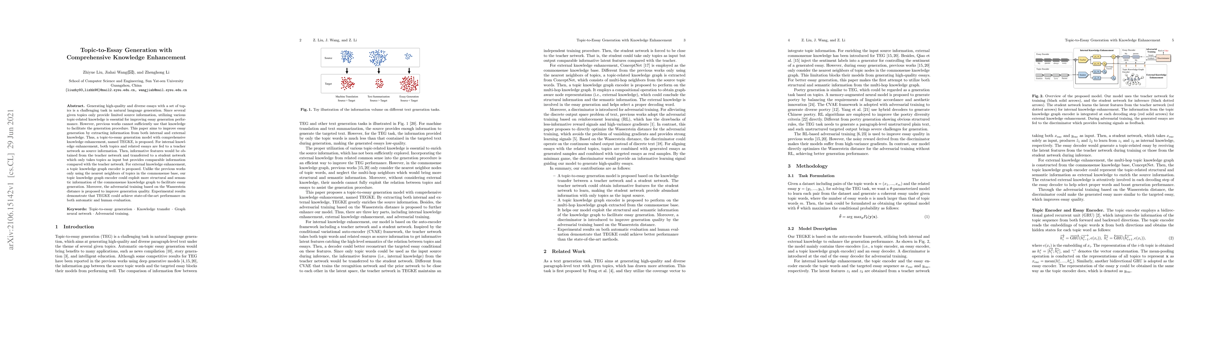This paper proposes TEGKE, a model for generating high-quality essays by enhancing knowledge from both internal sources (related essays) and external knowledge graphs. TEGKE uses a teacher network to extract features from topics and related essays, which are then transferred to a student network for topic-only input. It also employs a topic knowledge graph encoder to leverage broader semantic information, achieving state-of-the-art performance in essay generation.