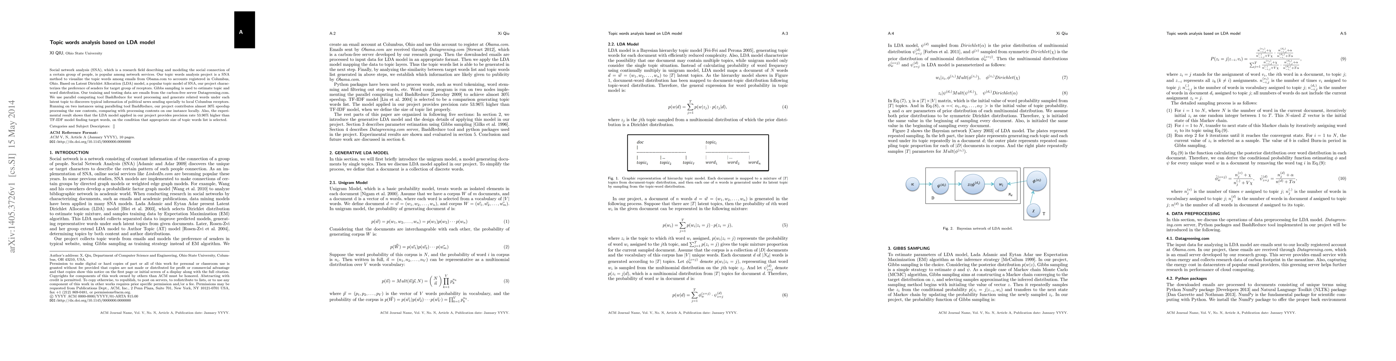 Social network analysis (SNA), which is a research field describing and modeling the social connection of a certain group of people, is popular among network services. Our topic words analysis project is a SNA method to visualize the topic words among emails from Obama.com to accounts registered in Columbus, Ohio. Based on Latent Dirichlet Allocation (LDA) model, a popular topic model of SNA, our project characterizes the preference of senders for target group of receptors. Gibbs sampling is used to estimate topic and word distribution. Our training and testing data are emails from the carbon-free server Datagreening.com. We use parallel computing tool BashReduce for word processing and generate related words under each latent topic to discovers typical information of political news sending specially to local Columbus receptors. Running on two instances using paralleling tool BashReduce, our project contributes almost 30% speedup processing the raw contents, comparing with processing contents on one instance locally. Also, the experimental result shows that the LDA model applied in our project provides precision rate 53.96% higher than TF-IDF model finding target words, on the condition that appropriate size of topic words list is selected.