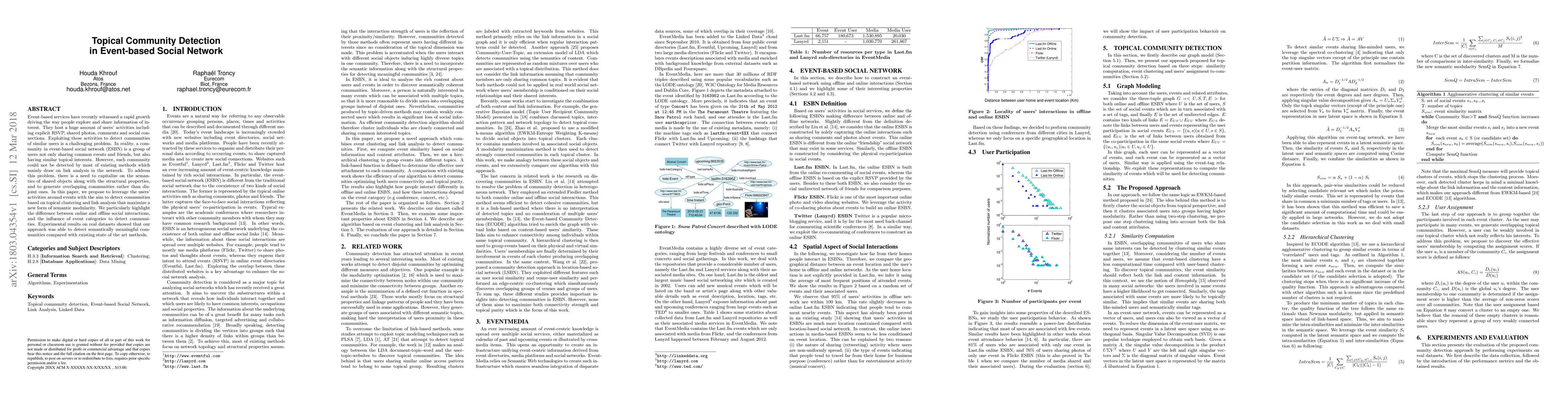 This paper proposes a novel method for detecting communities in event-based social networks by combining topical clustering of shared objects with link analysis, aiming to identify overlapping communities with semantically meaningful interests. Experimental results demonstrate superior performance compared to existing methods.