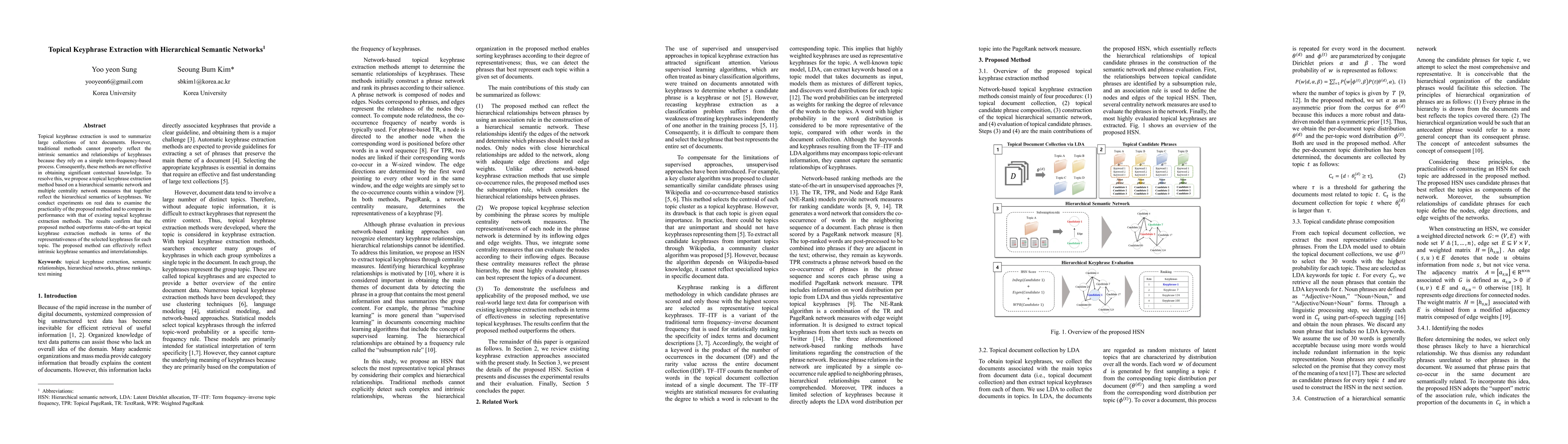 This paper proposes a novel topical keyphrase extraction method using hierarchical semantic networks and centrality measures to better capture keyphrase semantics and relationships. Experimental results show that this method outperforms existing techniques, offering more representative keyphrases for summarizing text documents.