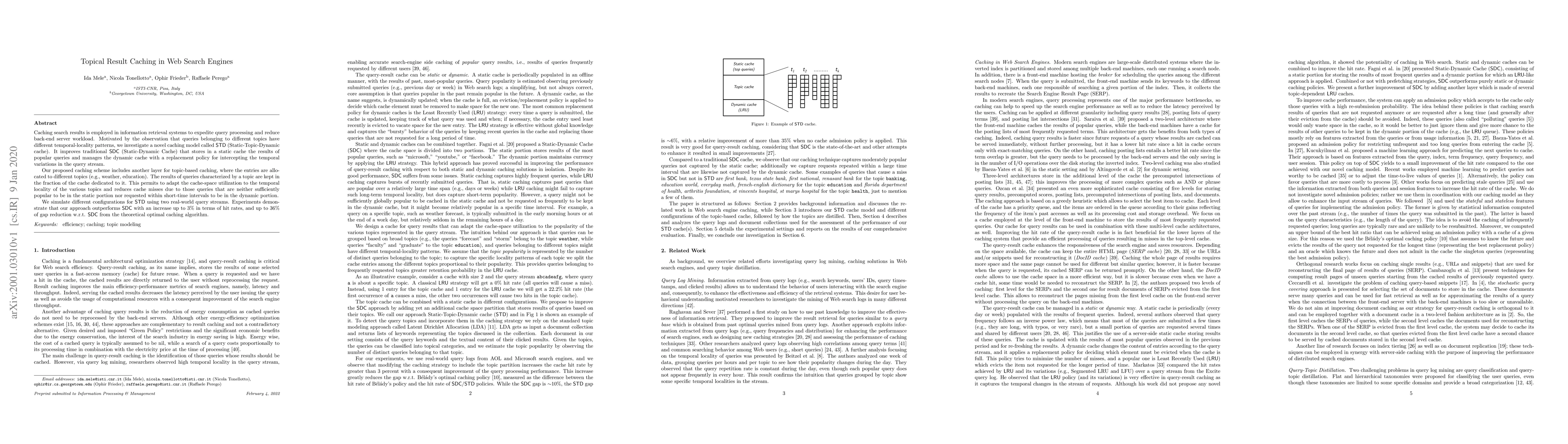 Caching search results is employed in information retrieval systems to expedite query processing and reduce back-end server workload. Motivated by the observation that queries belonging to different topics have different temporal-locality patterns, we investigate a novel caching model called STD (Static-Topic-Dynamic cache). It improves traditional SDC (Static-Dynamic Cache) that stores in a static cache the results of popular queries and manages the dynamic cache with a replacement policy for intercepting the temporal variations in the query stream. Our proposed caching scheme includes another layer for topic-based caching, where the entries are allocated to different topics (e.g., weather, education). The results of queries characterized by a topic are kept in the fraction of the cache dedicated to it. This permits to adapt the cache-space utilization to the temporal locality of the various topics and reduces cache misses due to those queries that are neither sufficiently popular to be in the static portion nor requested within short-time intervals to be in the dynamic portion. We simulate different configurations for STD using two real-world query streams. Experiments demonstrate that our approach outperforms SDC with an increase up to 3% in terms of hit rates, and up to 36% of gap reduction w.r.t. SDC from the theoretical optimal caching algorithm.