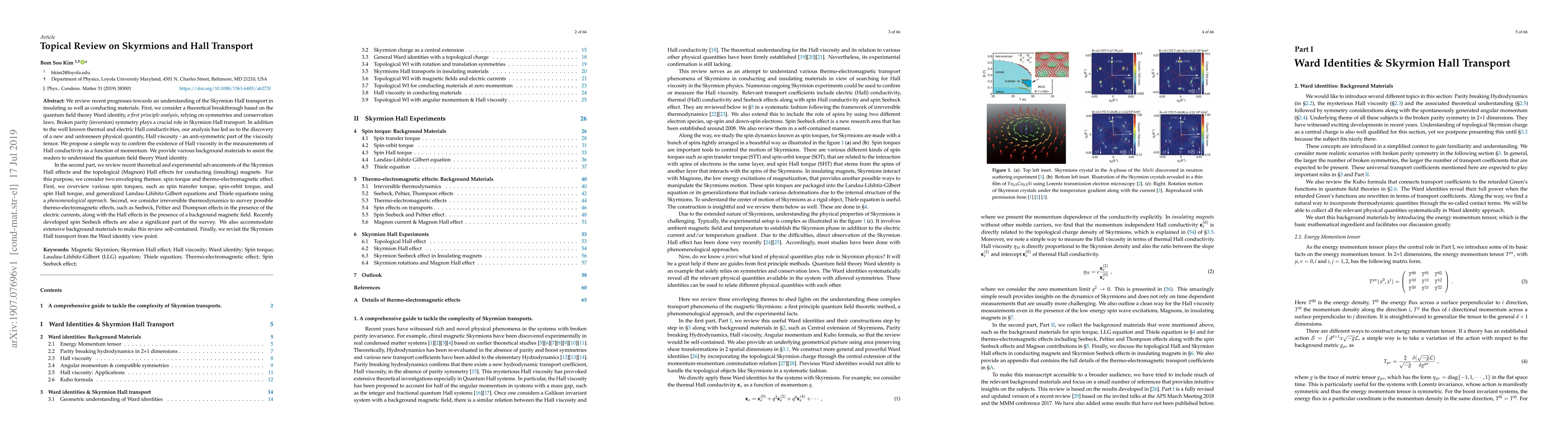 We review recent progresses towards an understanding of the Skyrmion Hall transport in insulating as well as conducting materials. First, we consider a theoretical breakthrough based on the quantum field theory Ward identity, a first principle analysis, relying on symmetries and conservation laws. Broken parity (inversion) symmetry plays a crucial role in Skyrmion Hall transport. In addition to the well known thermal and electric Hall conductivities, our analysis has led us to the discovery of a new and unforeseen physical quantity, Hall viscosity - an anti-symmetric part of the viscosity tensor. We propose a simple way to confirm the existence of Hall viscosity in the measurements of Hall conductivity as a function of momentum. We provide various background materials to assist the readers to understand the quantum field theory Ward identity. In the second part, we review recent theoretical and experimental advancements of the Skyrmion Hall effects and the topological (Magnon) Hall effects for conducting (insulting) magnets. For this purpose, we consider two enveloping themes: spin torque and thermo-electromagnetic effect. First, we overview various spin torques, such as spin transfer torque, spin-orbit torque, and spin Hall torque, and generalized Landau-Lifshitz-Gilbert equations and Thiele equations using a phenomenological approach. Second, we consider irreversible thermodynamics to survey possible thermo-electromagnetic effects, such as Seebeck, Peltier and Thompson effects in the presence of the electric currents, along with the Hall effects in the presence of a background magnetic field. Recently developed spin Seebeck effects are also a significant part of the survey. We also accommodate extensive background materials to make this review self-contained. Finally, we revisit the Skyrmion Hall transport from the Ward identity view point.