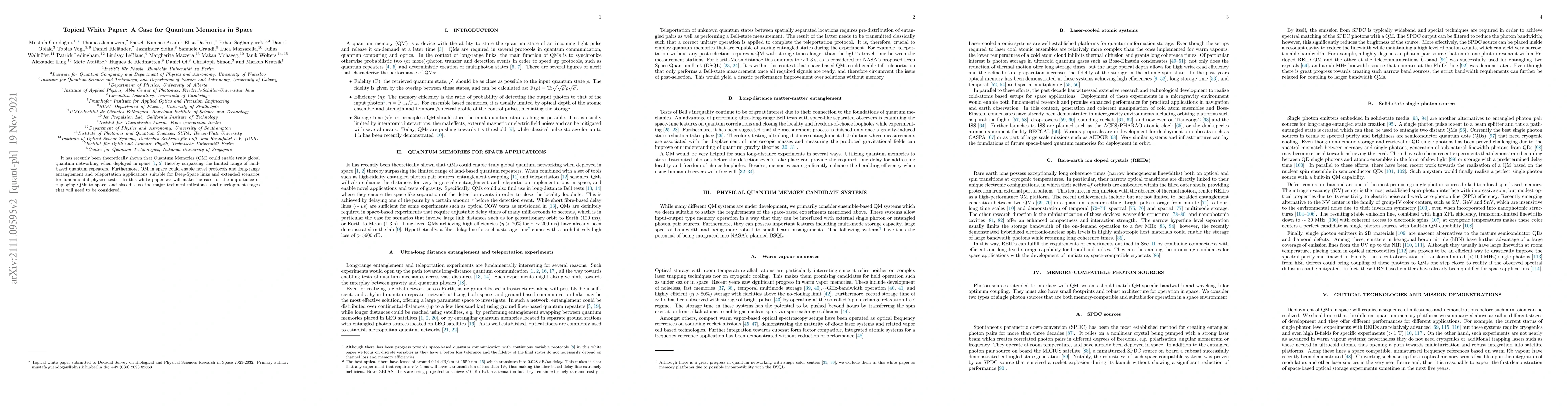 It has recently been theoretically shown that Quantum Memories (QM) could enable truly global quantum networking when deployed in space thereby surpassing the limited range of land-based quantum repeaters. Furthermore, QM in space could enable novel protocols and long-range entanglement and teleportation applications suitable for Deep-Space links and extended scenarios for fundamental physics tests. In this white paper we will make the case for the importance of deploying QMs to space, and also discuss the major technical milestones and development stages that will need to be considered.