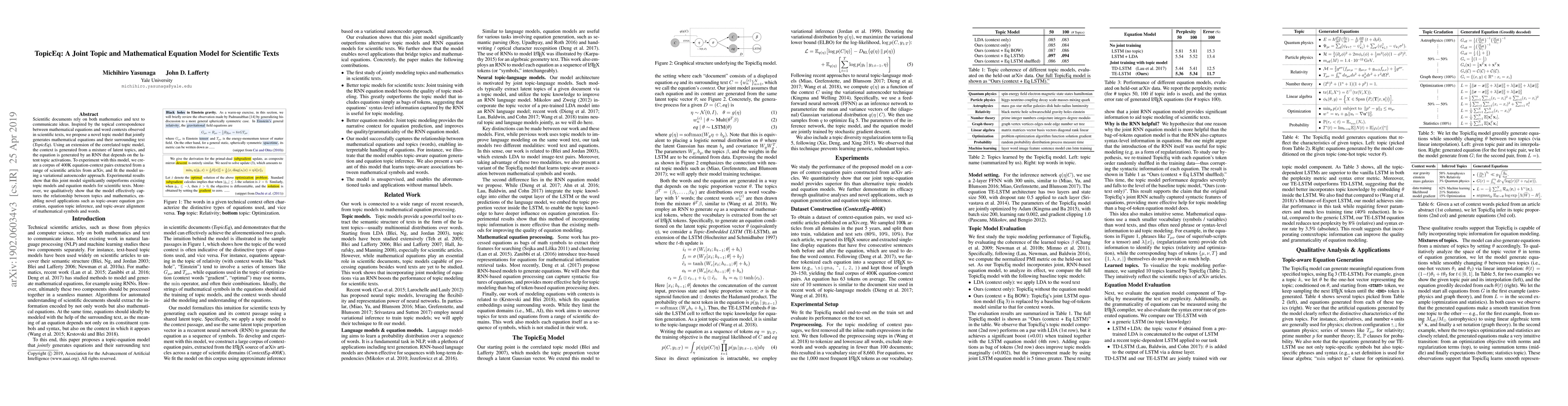 The paper proposes TopicEq, a novel joint topic and mathematical equation model for scientific texts, which outperforms existing models by generating both text and equations based on latent topics. The model is tested on a corpus of 400K equation-context pairs from arXiv and demonstrates effective topic-math relationship capture, enabling applications like topic-aware equation generation and topic inference.