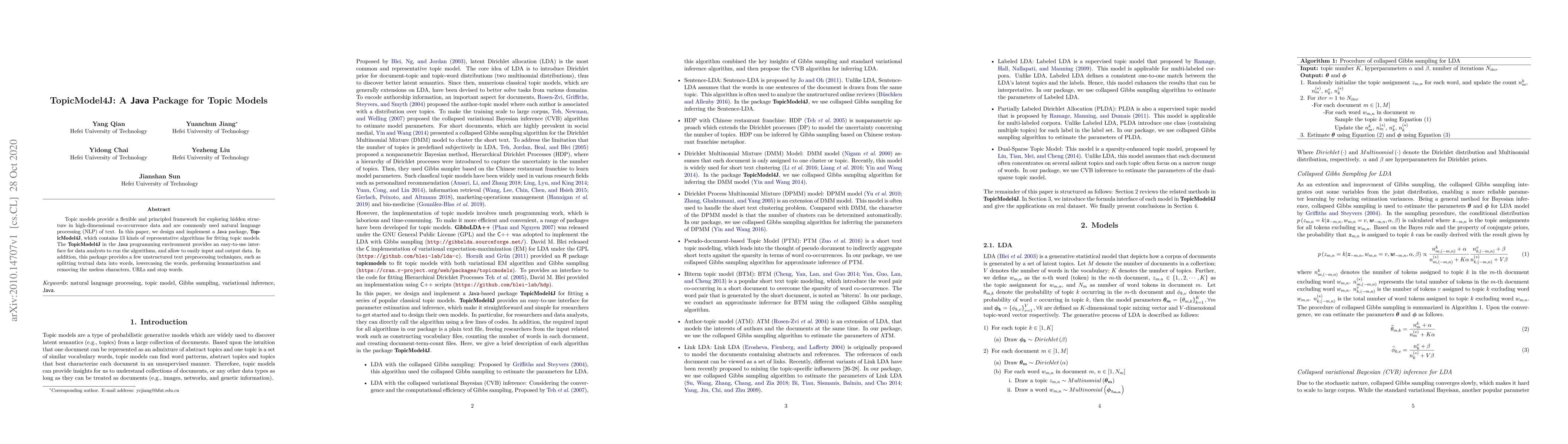 This paper introduces TopicModel4J, a Java package for implementing 13 representative topic modeling algorithms, facilitating NLP text analysis. It also includes text preprocessing techniques for data cleaning and transformation.