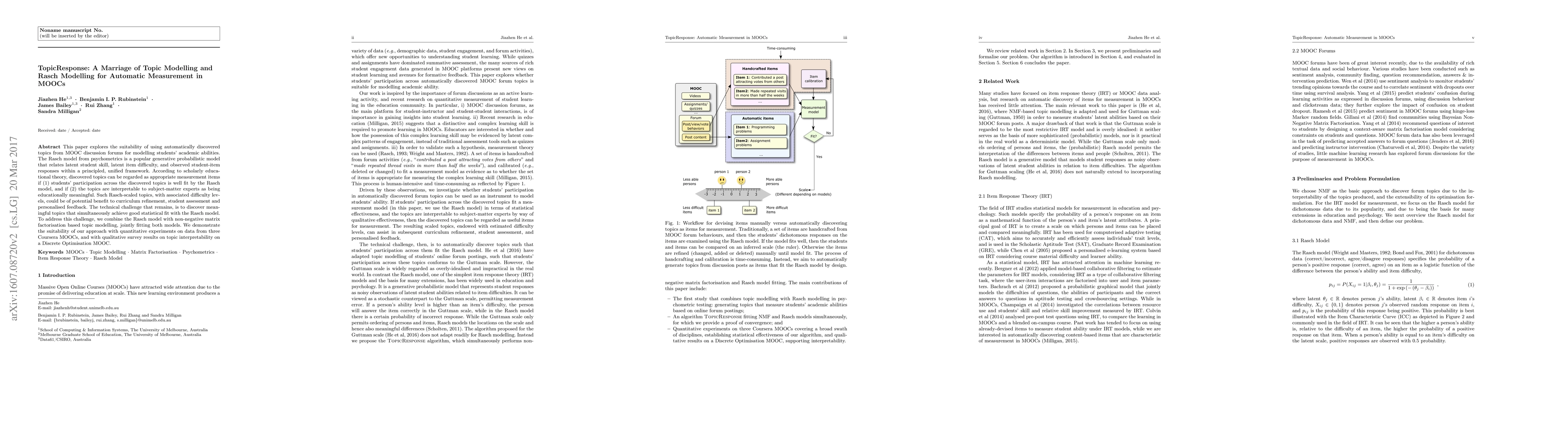 This paper combines topic modelling and Rasch modelling to automatically measure student abilities in MOOCs, demonstrating that well-fitted, educationally meaningful topics can enhance curriculum refinement and personalised feedback. Experiments on Coursera data and surveys show promising results for the joint fitting of both models.