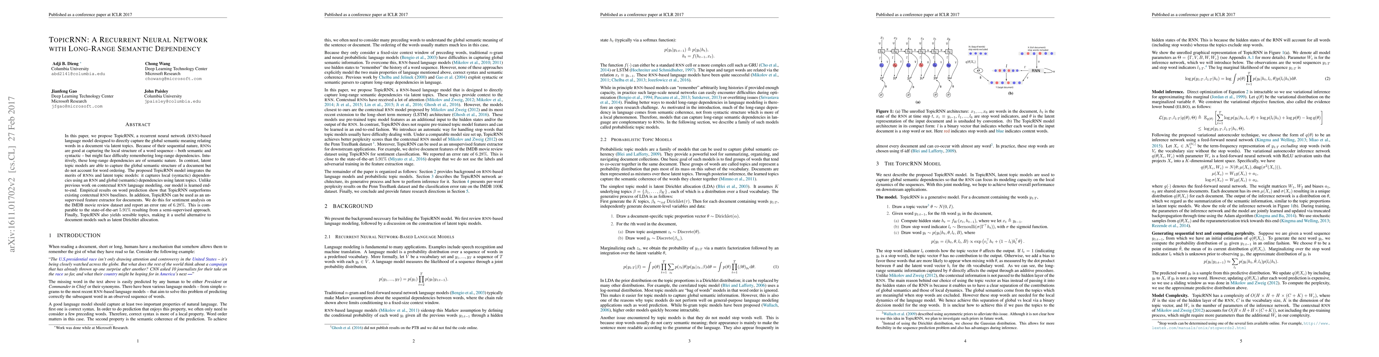 The paper proposes TopicRNN, a recurrent neural network that combines local syntactic dependencies from RNNs with global semantic dependencies via latent topics, achieving superior word prediction and comparable performance in sentiment analysis to state-of-the-art models.