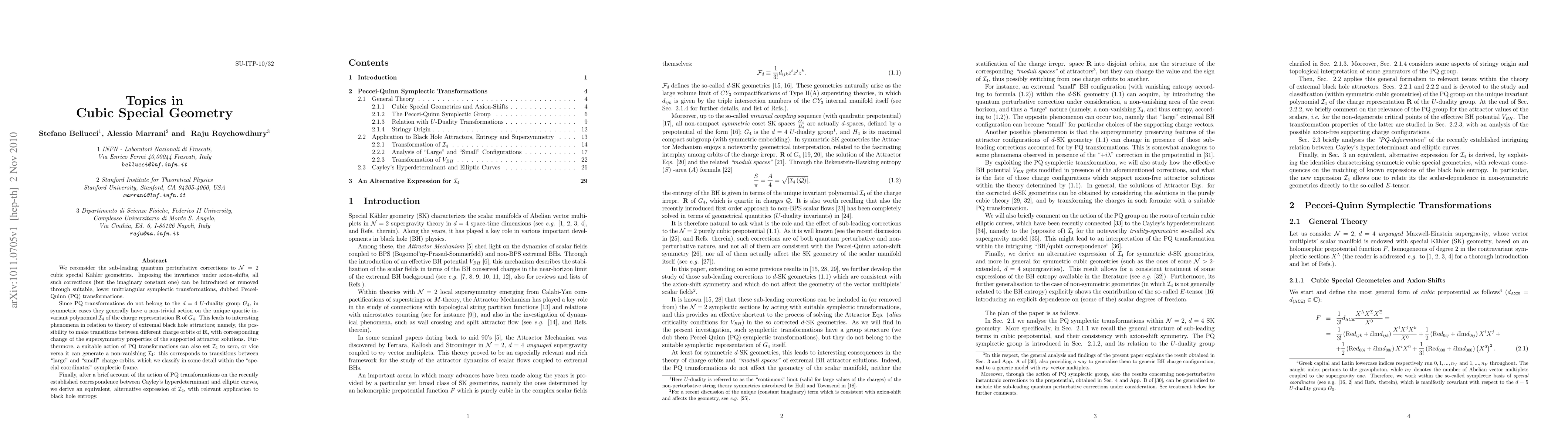 We reconsider the sub-leading quantum perturbative corrections to N=2 cubic special Kaehler geometries. Imposing the invariance under axion-shifts, all such corrections (but the imaginary constant one) can be introduced or removed through suitable, lower unitriangular symplectic transformations, dubbed Peccei-Quinn (PQ) transformations. Since PQ transformations do not belong to the d=4 U-duality group G4, in symmetric cases they generally have a non-trivial action on the unique quartic invariant polynomial I4 of the charge representation R of G4. This leads to interesting phenomena in relation to theory of extremal black hole attractors; namely, the possibility to make transitions between different charge orbits of R, with corresponding change of the supersymmetry properties of the supported attractor solutions. Furthermore, a suitable action of PQ transformations can also set I4 to zero, or vice versa it can generate a non-vanishing I4: this corresponds to transitions between "large" and "small" charge orbits, which we classify in some detail within the "special coordinates" symplectic frame. Finally, after a brief account of the action of PQ transformations on the recently established correspondence between Cayley's hyperdeterminant and elliptic curves, we derive an equivalent, alternative expression of I4, with relevant application to black hole entropy.