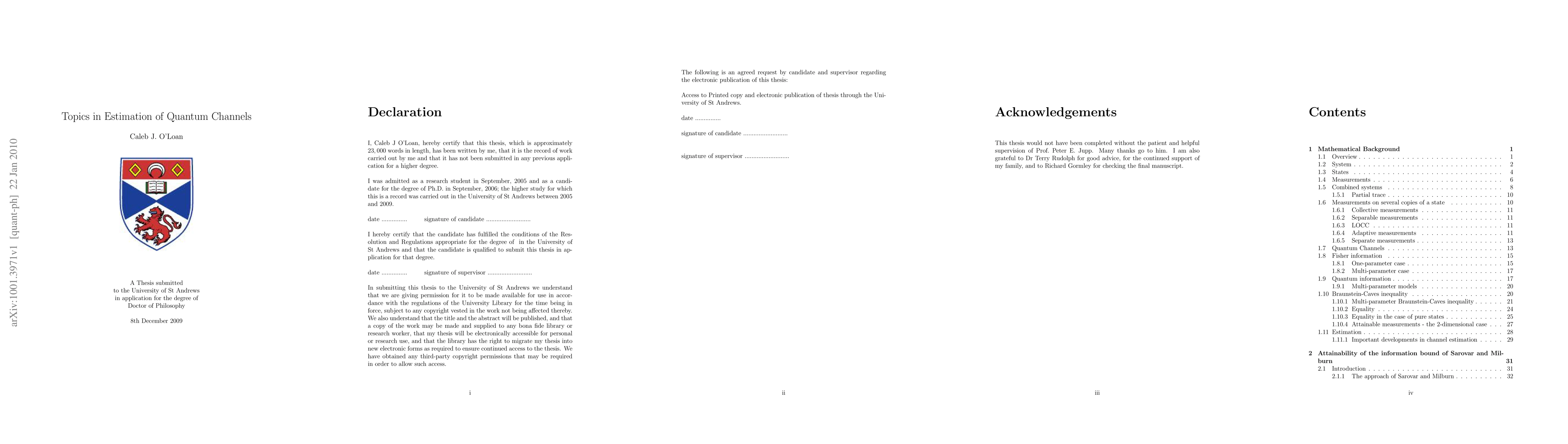This paper investigates two topics in quantum channel estimation: it answers questions about the Sarovar and Milburn bound on Fisher information and introduces a Riemannian metric for quantum states. It also explores the estimation of non-identical unitary channels, demonstrating improved estimation methods and a new, resource-efficient phase estimation technique.