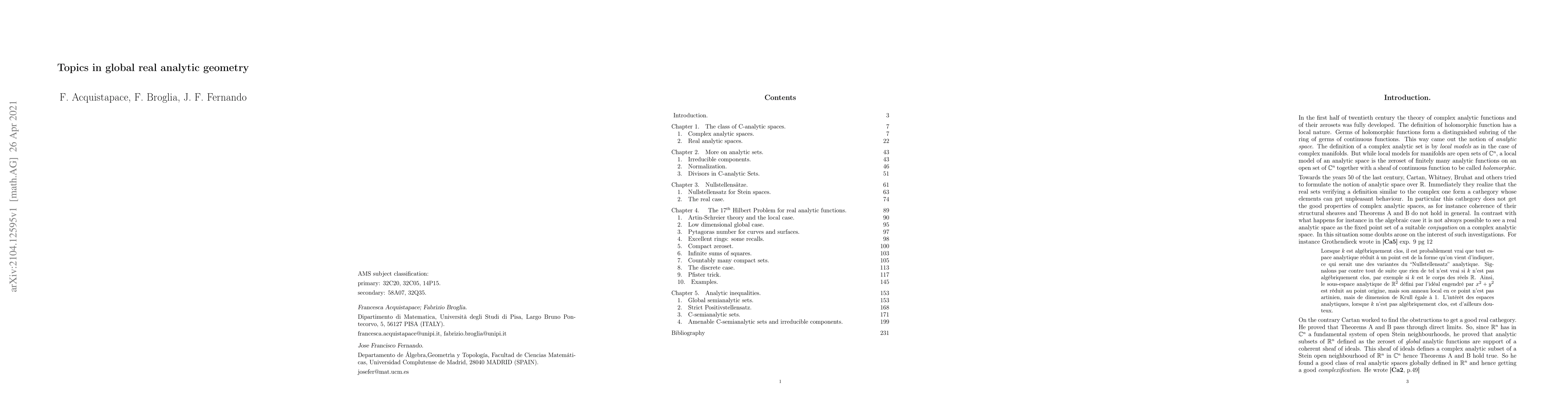 In the first half of twentieth century the theory of complex analytic functions and of their zerosets was fully developed. The definition of holomorphic function has a local nature. Germs of holomorphic functions form a distinguished subring of the ring of germs of continuous functions. This way came out the notion of analytic space. The definition of a complex analytic set is by local models as in the case of complex manifolds. But while local models for manifolds are open sets of ${\mathbb C}^n$, a local model of an analytic space is the zeroset of finitely many analytic functions on an open set of ${\mathbb C}^n$ together with a sheaf of continuous function to be called holomorphic. Towards the years $50$ of the last century, Cartan, Whitney, Bruhat and others tried to formulate the notion of analytic space over ${\mathbb R}$. Immediately they realize that the real sets verifying a definition similar to the complex one form a cathegory whose elements can get unpleasant behaviour. In particular this cathegory does not get the good properties of complex analytic spaces, as for instance coherence of their structural sheaves and Theorems A and B do not hold in general.