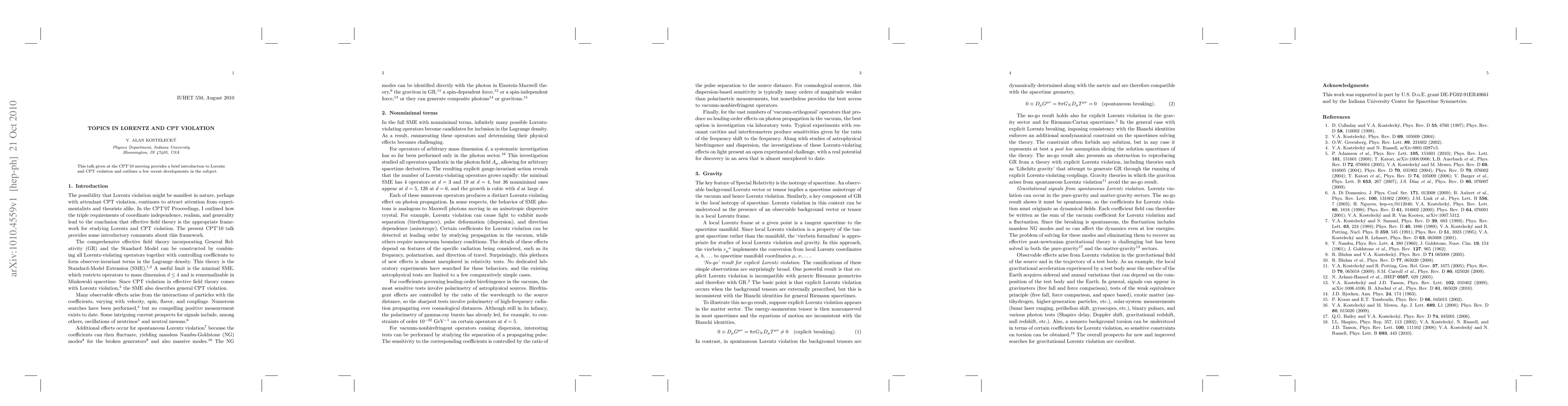 This talk given at the CPT'10 meeting provides a brief introduction to Lorentz and CPT violation and outlines a few recent developments in the subject.