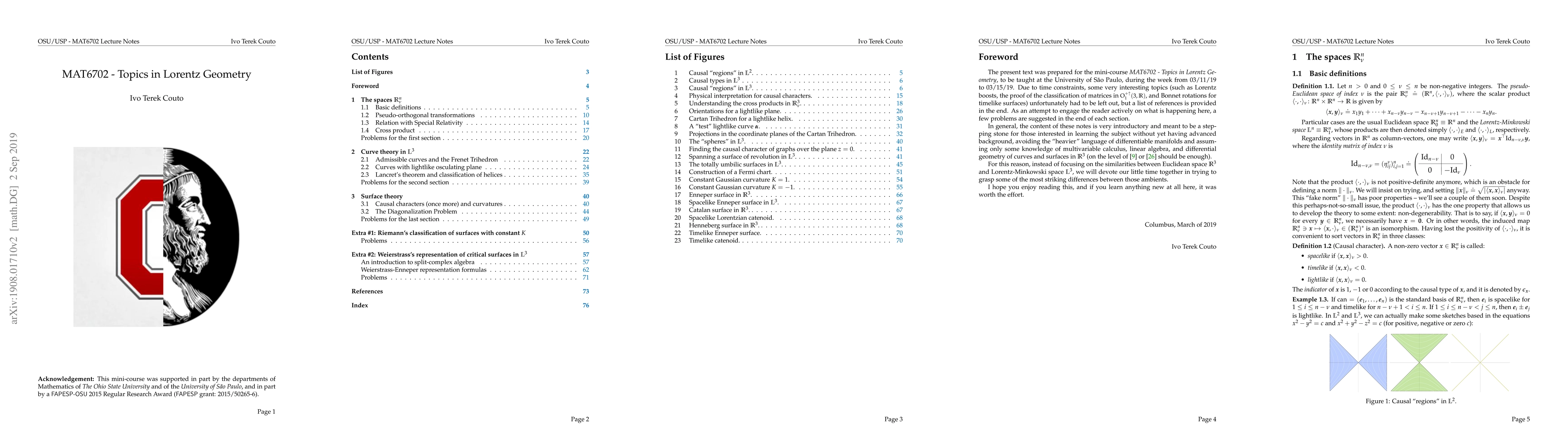 Two-line summary: These lecture notes cover linear algebra in pseudo-Euclidean space with a focus on Lorentz-Minkowski geometry, introduce the Fundamental Theorem of Curves adapted for degenerate osculating planes, and delve into the diagonalization of the Weingarten map for timelike surfaces, classifying surfaces with constant Gaussian curvature using split-complex algebra. References have been added for further reading.