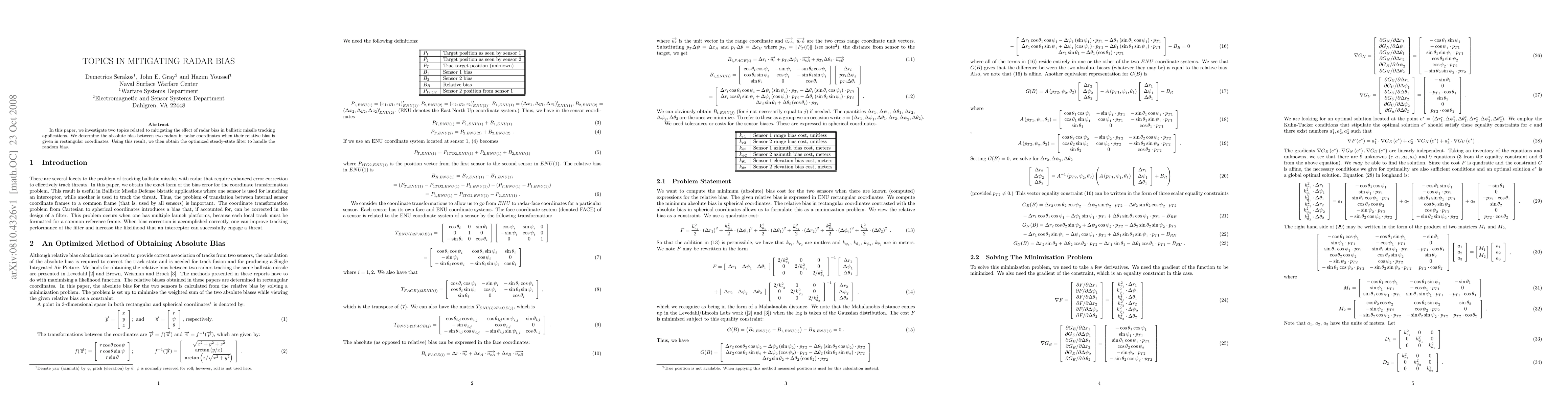 Researchers investigated techniques to mitigate radar bias in missile tracking, finding an optimized filter for handling random bias, and a method to convert between polar and rectangular coordinates for absolute bias calculation.