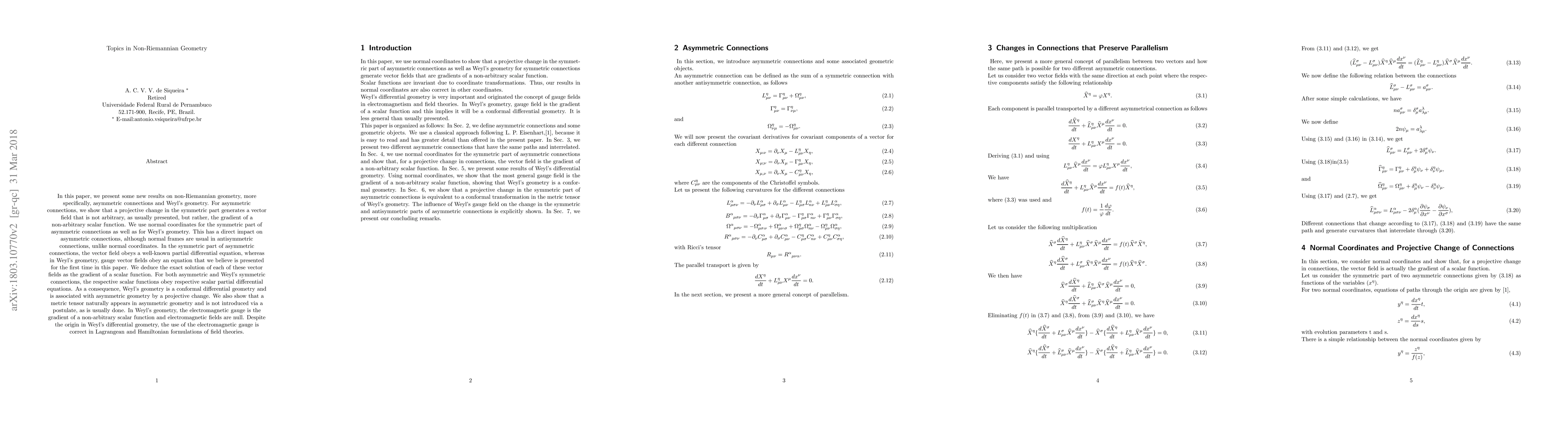 In this paper, we present some new results on non-Riemannian geometry, more specifically, asymmetric connections and Weyl's geometry. For asymmetric connections, we show that a projective change in the symmetric part generates a vector field that its not arbitrary, as usually presented, but rather, the gradient of a non-arbitrary scalar function. We use normal coordinates for the symmetric part of asymmetric connections as well as for the Weyl's geometry. This has a direct impact on asymmetric conections, although normal frames are usual in antisymmetic connections, unlike normal coordinates. In this symmetric part of asymmetric connections, the vector fields obeys a well-known partial differential equantion, whereas in Weyl's geometry, gauge vector fields obey an equation that we believe is presented for the first time in this paper. We deduce the exact solution of each of these vector fields as the gradient of a scalar function. For both asymmetric and Weyl's symmetric connections, the respective scalar functions obey respective scalar partial differential equations. As a consequence, Weyl's geometry is a conformal differential geometry and is associated with asymmetric geometry by a projective change. We also show that a metric tensor naturally appears in asymmetric geometry and is not introduced via a postulate, as is usually done. In Weyl's geometry, the eletromagnetic gauge is the gradient of a non-arbitrary scalar function and eletromagnetic fields are null. Despide the origin in Weyl's differential geometry, the use of the eletromagnetic gauge is correct in Lagrangean and Hamiltonian formulations of field theories.