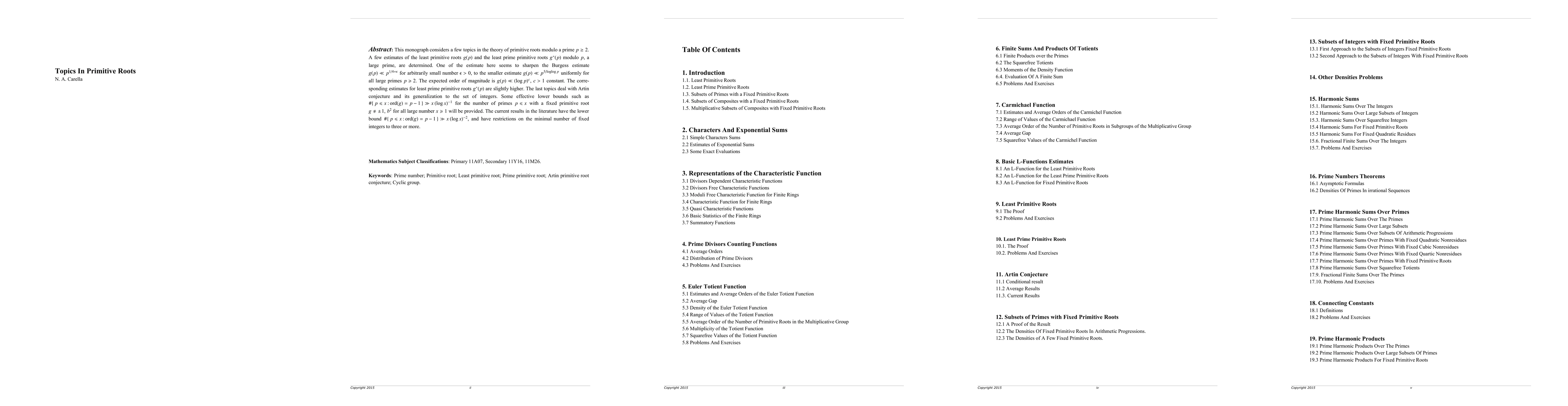 This monograph explores primitive roots g(p) modulo large primes p, providing new estimates for the least primitive roots and least prime primitive roots, including a sharper estimate for g(p) that improves upon the Burgess estimate. It also investigates effective lower bounds for the number of primes p ≤ x with a fixed primitive root, surpassing previous results without restrictions on minimal integers.