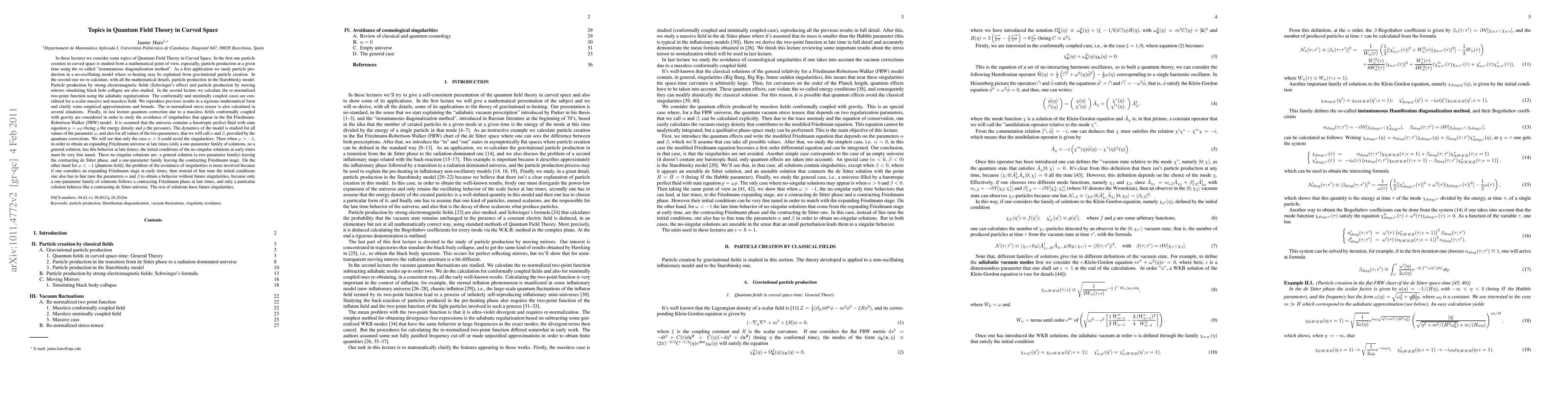 In these lectures we consider some topics of Quantum Field Theory in Curved Space. In the first one particle creation in curved space is studied from a mathematical point of view, especially, particle production at a given time using the so called "instantaneous diagonalization method". Particle production by strong electromagnetic fields (Schwinger's effect) and particle production by moving mirrors simulating black hole collapse are also studied. In the second lecture we calculate the re-normalized two-point function using the adiabatic regularization. The conformally and minimally coupled cases are considered for a scalar massive and massless field. We reproduce previous results in a rigorous mathematical form and clarify some empirical approximations and bounds. The re-normalized stress tensor is also calculated in several situations. Finally, in last lecture quantum correction due to a massless fields conformally coupled with gravity are considered in order to study the avoidance of singularities that appear in the flat Friedmann-Robertson-Walker (FRW) model.