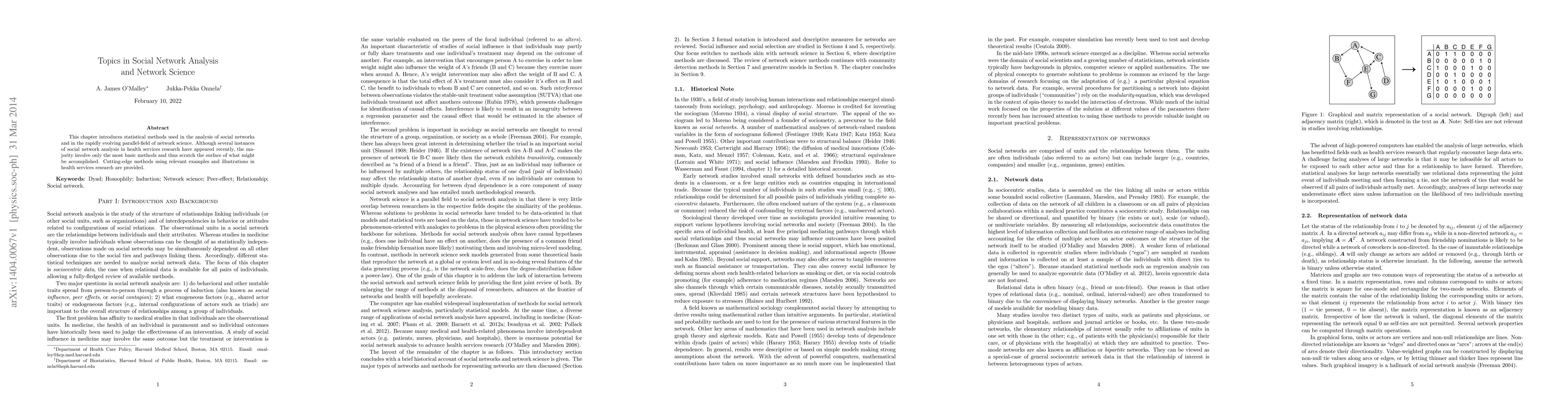 This chapter introduces statistical methods used in the analysis of social networks and in the rapidly evolving parallel-field of network science. Although several instances of social network analysis in health services research have appeared recently, the majority involve only the most basic methods and thus scratch the surface of what might be accomplished. Cutting-edge methods using relevant examples and illustrations in health services research are provided.