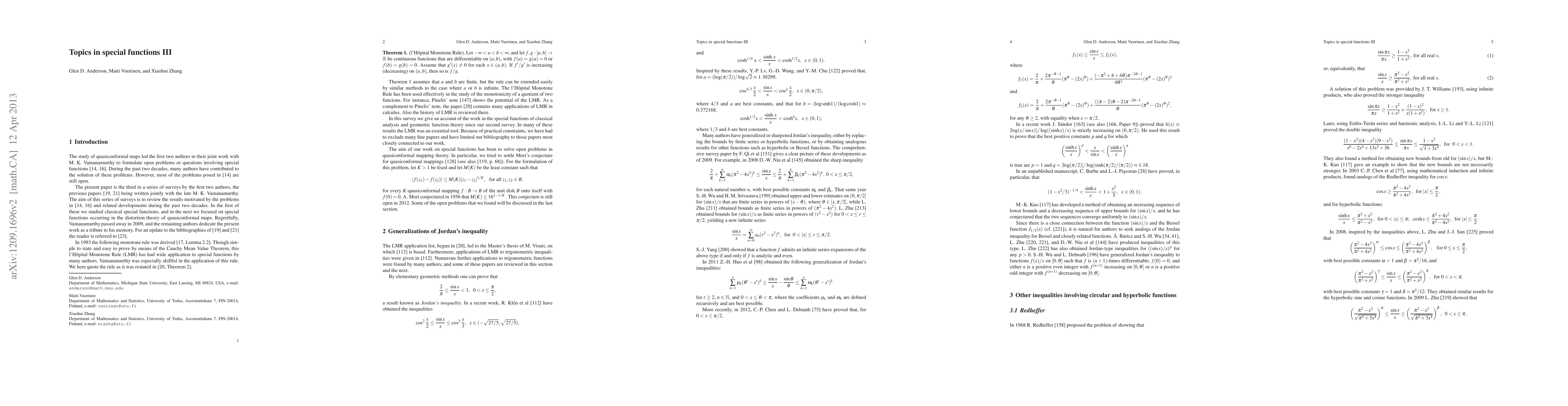 The authors survey recent results in special functions of classical analysis and geometric function theory, in particular the circular and hyperbolic functions, the gamma function, the elliptic integrals, the Gaussian hypergeometric function, power series, and mean values.