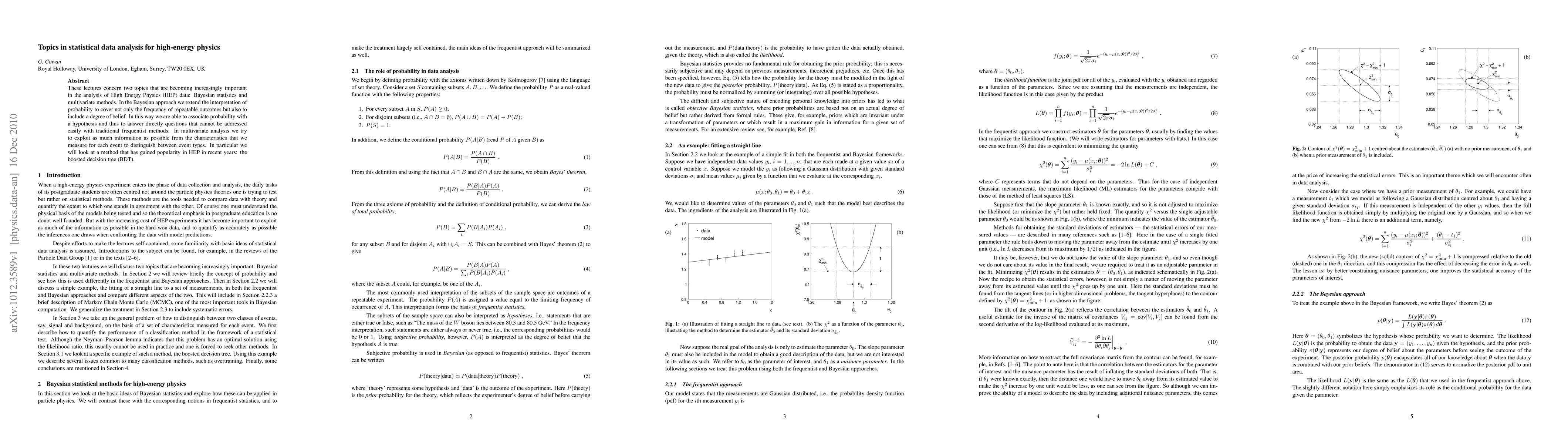 These lectures concern two topics that are becoming increasingly important in the analysis of High Energy Physics (HEP) data: Bayesian statistics and multivariate methods. In the Bayesian approach we extend the interpretation of probability to cover not only the frequency of repeatable outcomes but also to include a degree of belief. In this way we are able to associate probability with a hypothesis and thus to answer directly questions that cannot be addressed easily with traditional frequentist methods. In multivariate analysis we try to exploit as much information as possible from the characteristics that we measure for each event to distinguish between event types. In particular we will look at a method that has gained popularity in HEP in recent years: the boosted decision tree (BDT).