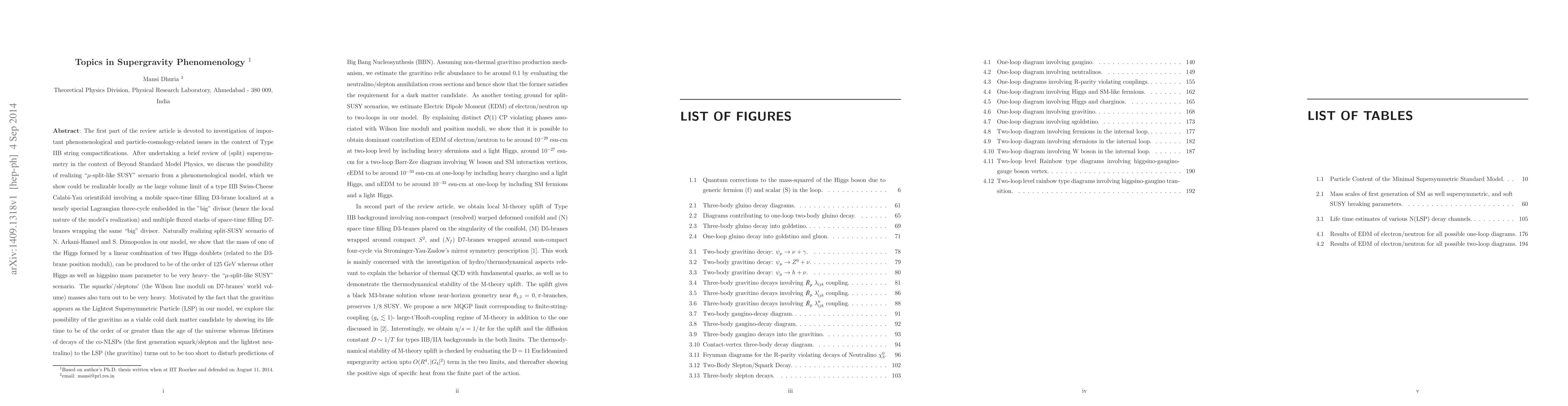 In the first part of the review article, we discuss the possibility of realizing "mu-split-like SUSY" scenario from a phenomenological model, which we show could be realizable locally as the large volume limit of a type IIB Swiss-Cheese Calabi-Yau orientifold involving a mobile space-time filling D3-brane localized at a nearly special Lagrangian three-cycle embedded in the "big" divisor and multiple fluxed stacks of space-time filling D7-branes wrapping the same "big" divisor. We show that the mass of one of the Higgs doublets can be produced to be of the order of 125 GeV whereas other Higgs as well as higgsino mass parameter to be very heavy- the "mu-split-like SUSY" scenario. Then we discuss the role of the heavy squarks/sleptons and the light Higgs in (i) obtaining long-lived gluinos (ii) in verifying that the NLSPs (squarks/sleptons/neutralino) decay into the LSP (gravitino) respects the BBN constraints with the lifetime of the LSP (gravitino) coming out to be of the order or larger than the age of the universe, (iii) getting gravitino relic abundance of around 0.1, and (iv) obtaining electronic EDM close to the experimental upper bounds. In second part of the review article, we obtain local M-theory uplift of Type IIB background involving non-compact (resolved) warped deformed conifold and (N) space time filling D3-branes placed on the singularity of the conifold, (M) D5-branes wrapped around compact 2-sphere, and (N_f) D7-branes wrapped around non-compact four-cycle via Strominger-Yau-Zaslow's mirror symmetry prescription and show the stability of the solution so obtained. We propose a new MQGP limit corresponding to finite-string-coupling (g_s~ 1)- large-t'Hooft-coupling regime of M-theory. Interestingly, we obtain eta/s=1/4 pi for the uplift and the diffusion constant D~1/T for types IIB/IIA backgrounds in the both limits.