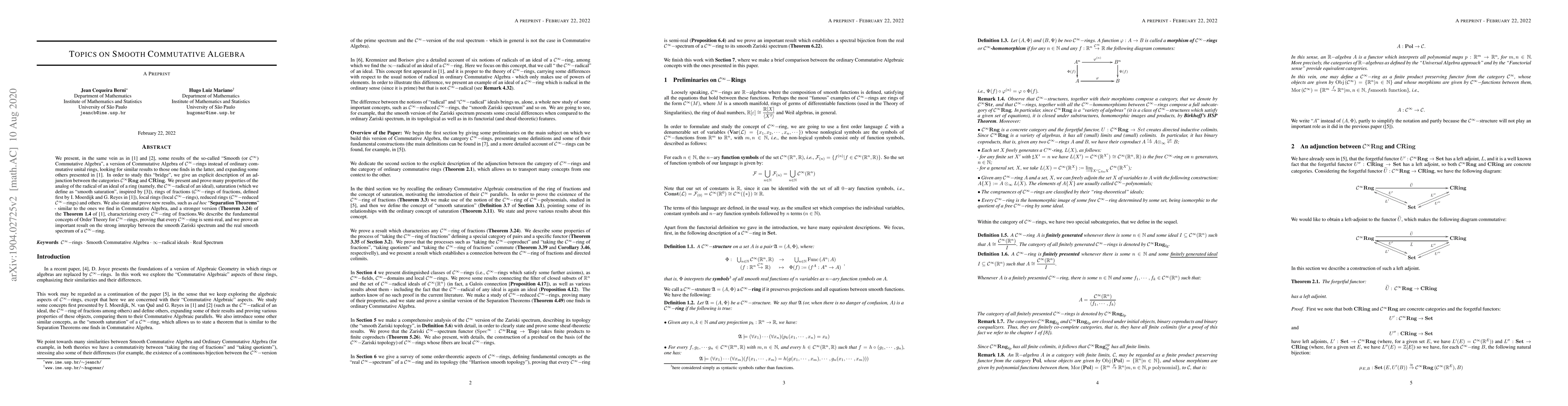 We present, in the same vein as in [20] and [21], some results of the so-called "Smooth (or $\mathcal{C}^\infty$) Commutative Algebra", a version of Commutative Algebra of $\mathcal{C}^{\infty}-$rings instead of ordinary commutative unital rings, looking for similar results to those one finds in the latter, and expanding some others presented in [20]. We give an explicit description of an adjunction between the categories $\mathcal{C}^\infty{\rm Rng}$ and ${\rm CRing}$, in order to study this "bridge". We present and prove many properties of the analog of the radical of an ideal of a ring (namely, the $\mathcal{C}^\infty$-radical of an ideal), saturation (which we define as "smooth saturation", inspired by [13]), rings of fractions ($\mathcal{C}^\infty$-rings of fractions, defined first by I. Moerdijk and G. Reyes in [20]), local rings (local $\mathcal{C}^\infty$-rings), reduced rings ($\mathcal{C}^\infty$-reduced $\mathcal{C}^\infty$-rings) and others. We also state and prove new results, such as ad hoc "Separation Theorems", similar to the ones we find in Commutative Algebra, and a stronger version (Theorem 6) of the Theorem 1.4 of [20], characterizing every $\mathcal{C}^\infty$-ring of fractions. We describe the fundamental concepts of Order Theory for $\mathcal{C}^\infty$-rings, proving that every $\mathcal{C}^\infty$-ring is semi-real, and we prove an important result on the strong interplay between the smooth Zariski spectrum and the real smooth spectrum of a $\mathcal{C}^\infty$-ring.