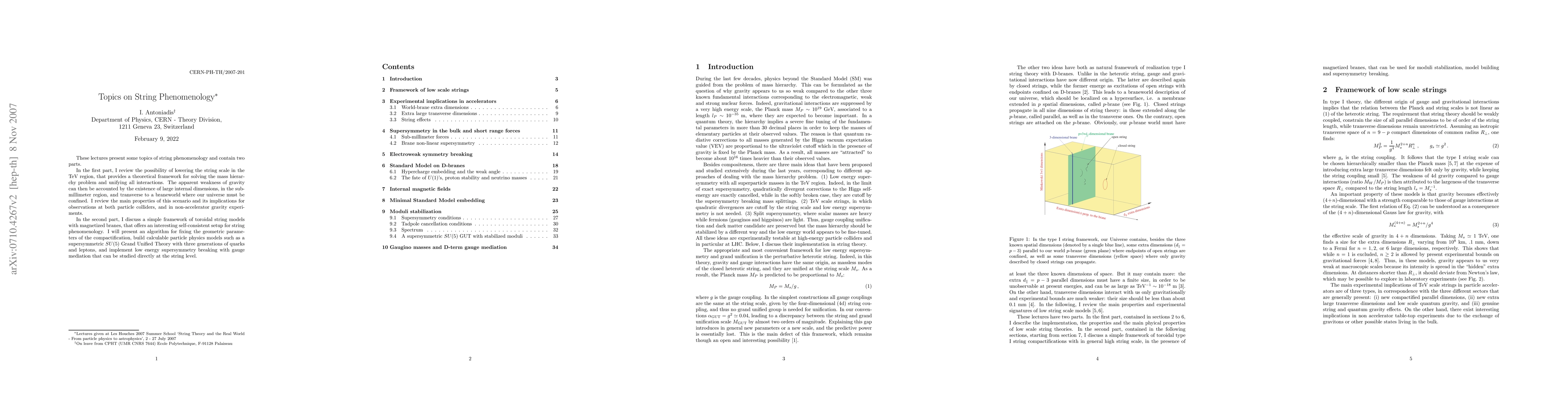 These lectures present some topics of string phenomenology and contain two parts. In the first part, I review the possibility of lowering the string scale in the TeV region, that provides a theoretical framework for solving the mass hierarchy problem and unifying all interactions. The apparent weakness of gravity can then be accounted by the existence of large internal dimensions, in the submillimeter region, and transverse to a braneworld where our universe must be confined. I review the main properties of this scenario and its implications for observations at both particle colliders, and in non-accelerator gravity experiments. In the second part, I discuss a simple framework of toroidal string models with magnetized branes, that offers an interesting self-consistent setup for string phenomenology. I will present an algorithm for fixing the geometric parameters of the compactification, build calculable particle physics models such as a supersymmetric SU(5) Grand Unified Theory with three generations of quarks and leptons, and implement low energy supersymmetry breaking with gauge mediation that can be studied directly at the string level.
