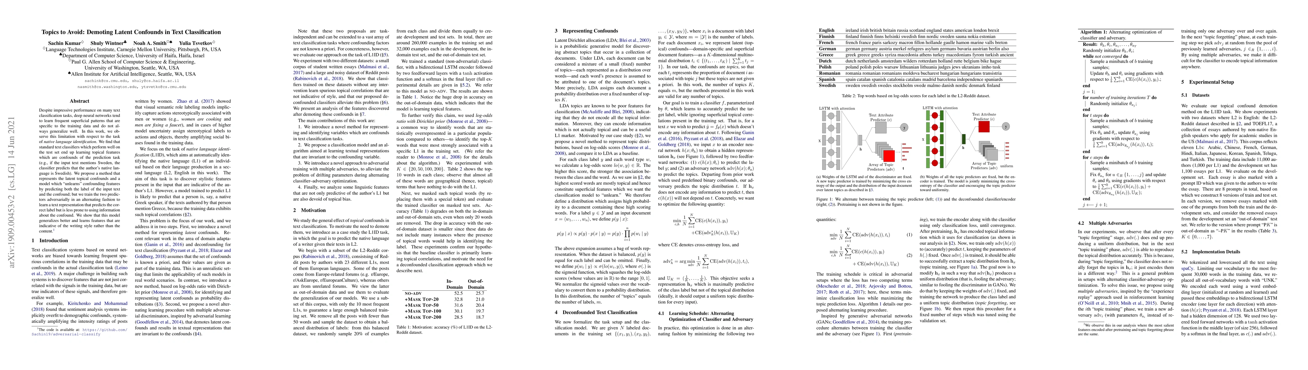 Despite impressive performance on many text classification tasks, deep neural networks tend to learn frequent superficial patterns that are specific to the training data and do not always generalize well. In this work, we observe this limitation with respect to the task of native language identification. We find that standard text classifiers which perform well on the test set end up learning topical features which are confounds of the prediction task (e.g., if the input text mentions Sweden, the classifier predicts that the author's native language is Swedish). We propose a method that represents the latent topical confounds and a model which "unlearns" confounding features by predicting both the label of the input text and the confound; but we train the two predictors adversarially in an alternating fashion to learn a text representation that predicts the correct label but is less prone to using information about the confound. We show that this model generalizes better and learns features that are indicative of the writing style rather than the content.