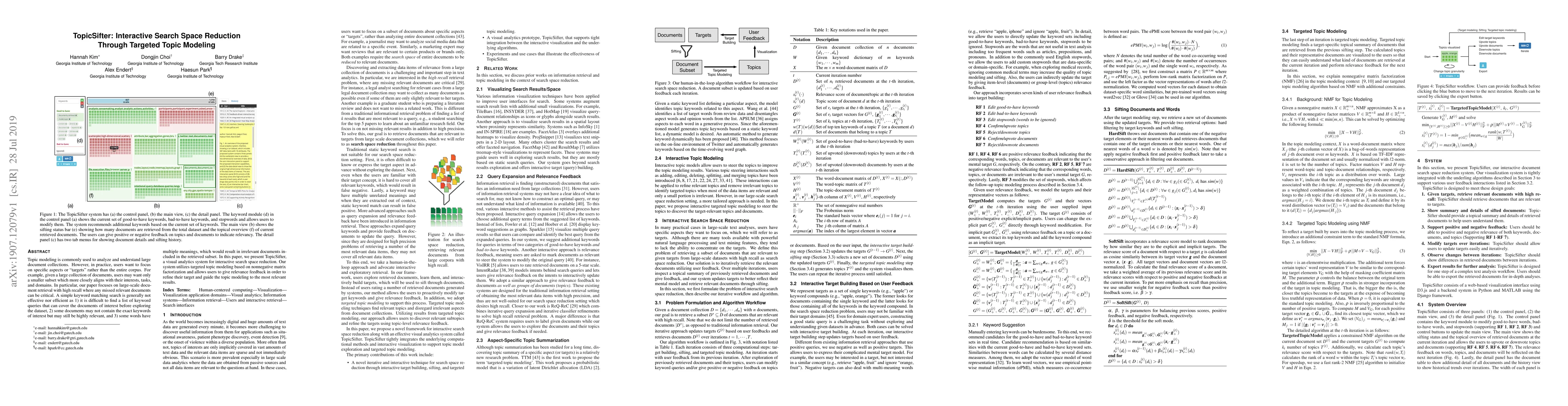 Topic modeling is commonly used to analyze and understand large document collections. However, in practice, users want to focus on specific aspects or "targets" rather than the entire corpus. For example, given a large collection of documents, users may want only a smaller subset which more closely aligns with their interests, tasks, and domains. In particular, our paper focuses on large-scale document retrieval with high recall where any missed relevant documents can be critical. A simple keyword matching search is generally not effective nor efficient as 1) it is difficult to find a list of keyword queries that can cover the documents of interest before exploring the dataset, 2) some documents may not contain the exact keywords of interest but may still be highly relevant, and 3) some words have multiple meanings, which would result in irrelevant documents included in the retrieved subset. In this paper, we present TopicSifter, a visual analytics system for interactive search space reduction. Our system utilizes targeted topic modeling based on nonnegative matrix factorization and allows users to give relevance feedback in order to refine their target and guide the topic modeling to the most relevant results.