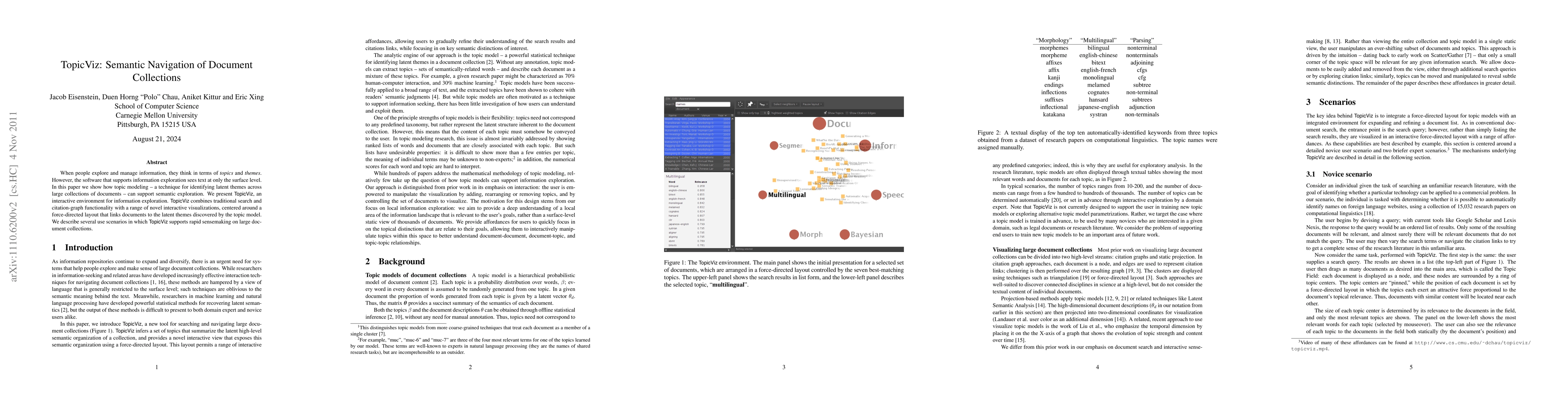 TopicViz enhances semantic navigation in document collections by integrating topic modeling with interactive visualizations, enabling users to explore latent themes and facilitate rapid sensemaking. The system combines traditional search and citation-graph features with novel visualizations to support information exploration.