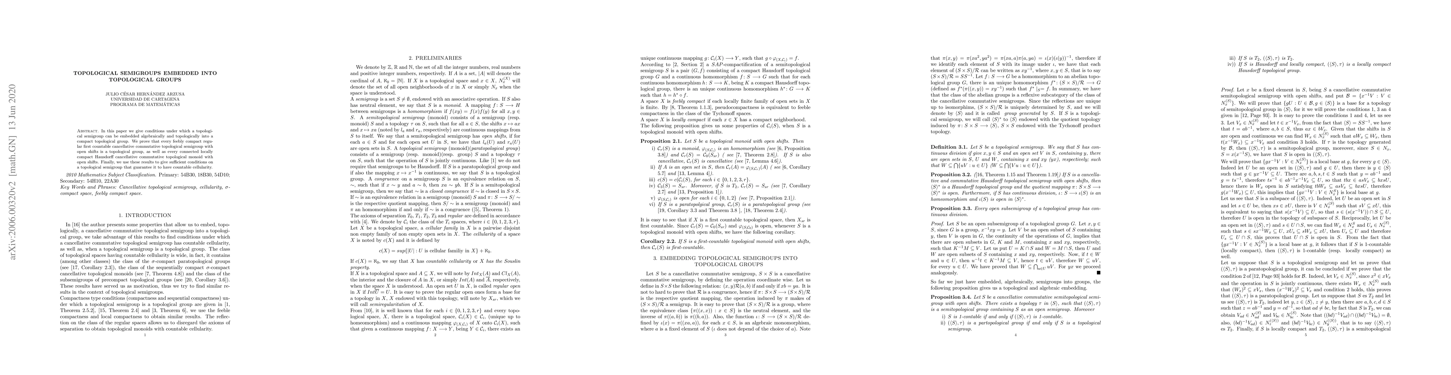 In this paper we give conditions under which a topological semigroup can be embedded algebraically and topologically into a compact topological group. We prove that every feebly compact regular first countable cancellative commutative topological semigroup with open shifts is a topological group, as well as every connected locally compact Hausdorff cancellative commutative topological monoid with open shifts. Finally, we use these results to give sufficient conditions on a topological semigroup that guarantee it to have countable cellularity.