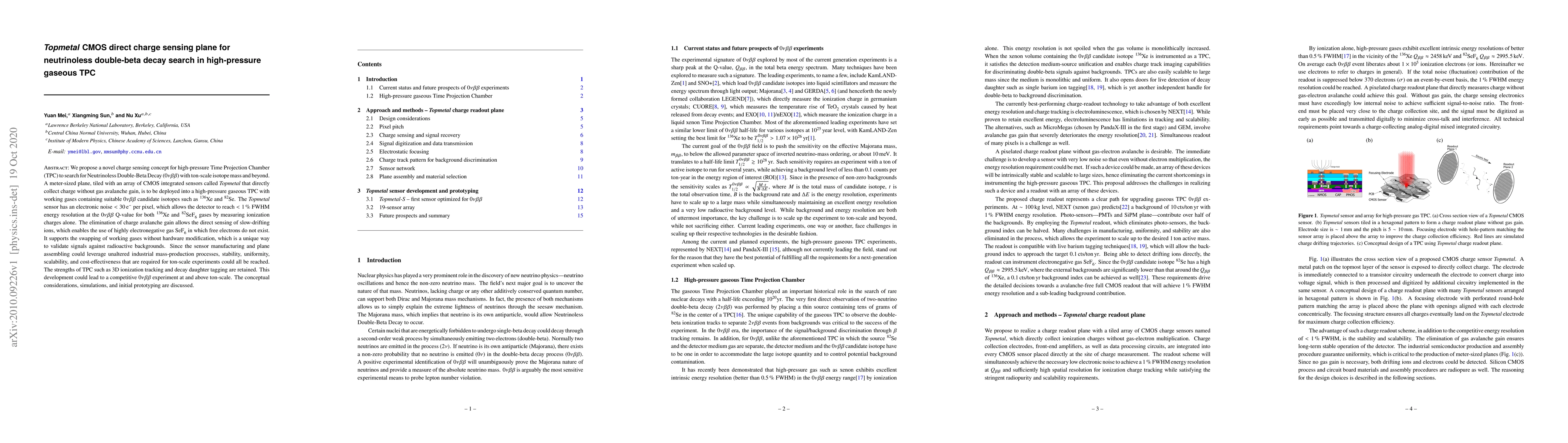 The paper introduces a new CMOS sensor, Topmetal, for high-pressure TPCs to search for neutrinoless double-beta decay using isotopes like Xe-136 and Se-82. This sensor directly collects charge without amplification, enabling better energy resolution and gas flexibility, potentially making large-scale experiments more feasible and cost-effective.