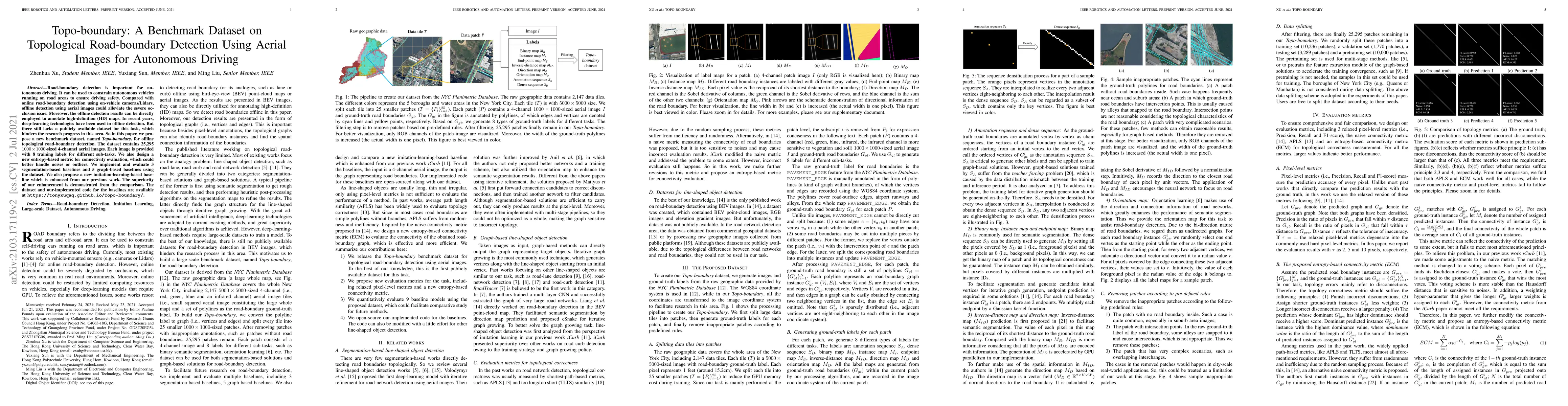 This paper introduces the Topo-boundary dataset, a new benchmark for offline topological road-boundary detection using aerial images, aiming to enhance autonomous driving safety. The dataset includes 25,295 high-resolution aerial images with 8 training labels for various sub-tasks, along with a new entropy-based metric for connectivity evaluation.