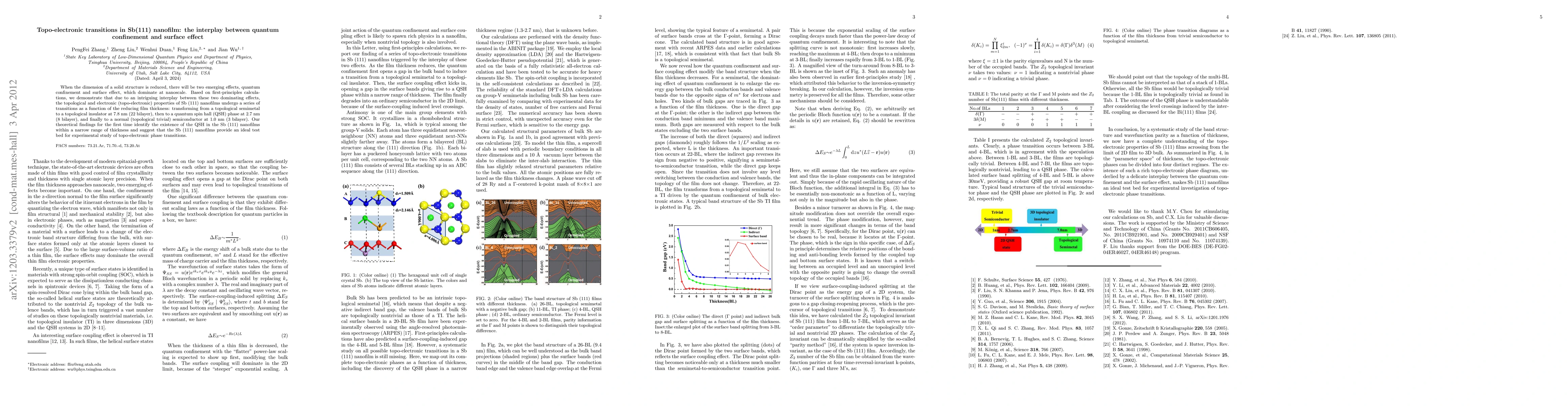 When the dimension of a solid structure is reduced, there will be two emerging effects, quantum confinement and surface effect, which dominate at nanoscale. Based on first-principles calculations, we demonstrate that due to an intriguing interplay between these two dominating effects, the topological and electronic (topo-electronic) properties of Sb (111) nanofilms undergo a series of transitions as a function of the reducing film thickness: transforming from a topological semimetal to a topological insulator at 7.8 nm (22 bilayer), then to a quantum spin hall (QSH) phase at 2.7 nm (8 bilayer), and finally to a normal (topological trivial) semiconductor at 1.0 nm (3 bilayer). Our theoretical findings for the first time identify the existence of the QSH in the Sb (111) nanofilms within a narrow range of thickness and suggest that the Sb (111) nanofilms provide an ideal test bed for experimental study of topo-electronic phase transitions.