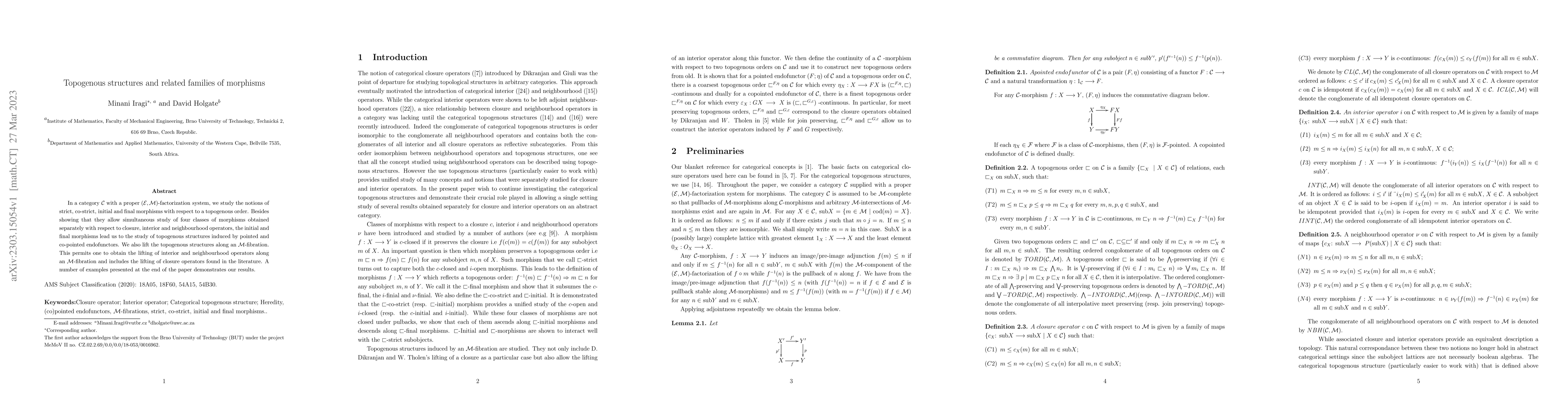 In a category $\mathcal{C}$ with a proper $(\mathcal{E}, \mathcal{M})$-factorization system, we study the notions of strict, co-strict, initial and final morphisms with respect to a topogenous order. Besides showing that they allow simultaneous study of four classes of morphisms obtained separately with respect to closure, interior and neighbourhood operators, the initial and final morphisms lead us to the study of topogenous structures induced by pointed and co-pointed endofunctors. We also lift the topogenous structures along an $\mathcal{M}$-fibration. This permits one to obtain the lifting of interior and neighbourhood operators along an $\mathcal{M}$-fibration and includes the lifting of closure operators found in the literature. A number of examples presented at the end of the paper demonstrates our results.