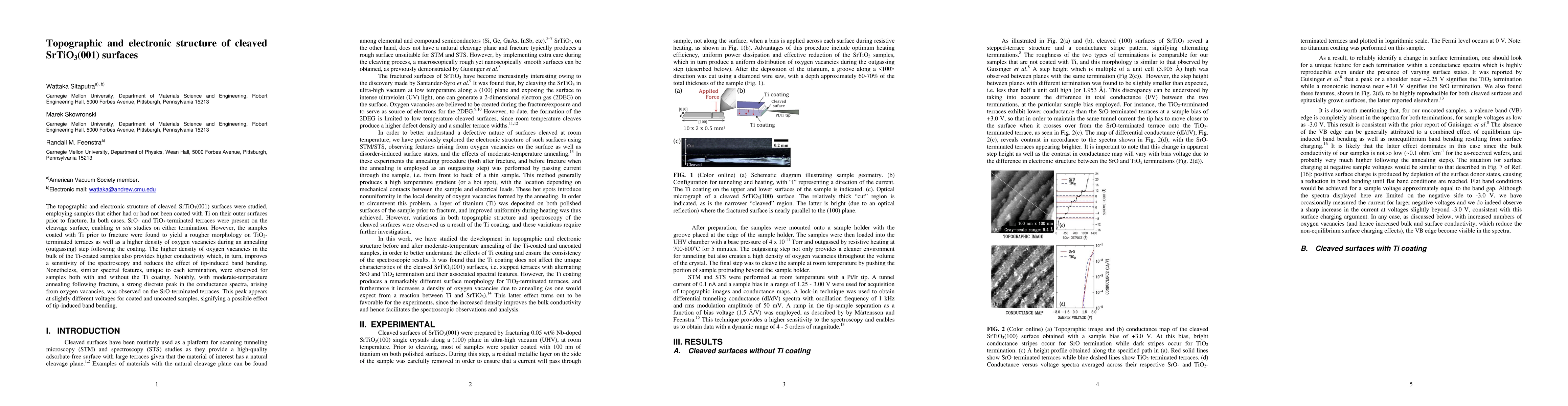This paper investigates the topographic and electronic structure of cleaved SrTiO3(001) surfaces, finding that Ti-coated samples exhibit rougher TiO2-terminated terraces and higher oxygen vacancy density, leading to increased conductivity and improved spectroscopy sensitivity. Despite these differences, both coated and uncoated samples show unique spectral features for each termination, with a distinct conductance peak from oxygen vacancies observed on SrO-terminated terraces.