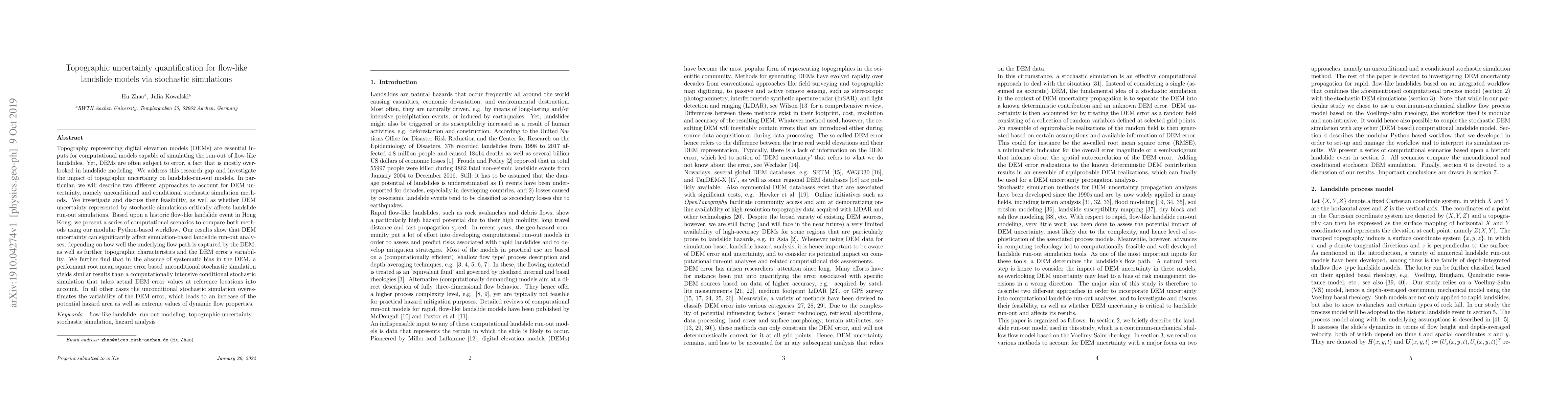 This paper investigates the impact of digital elevation model (DEM) uncertainty on flow-like landslide run-out simulations using stochastic methods. It compares unconditional and conditional stochastic simulations, finding that DEM uncertainty significantly affects simulation results, with the unconditional method often overestimating variability and potential hazard areas.
