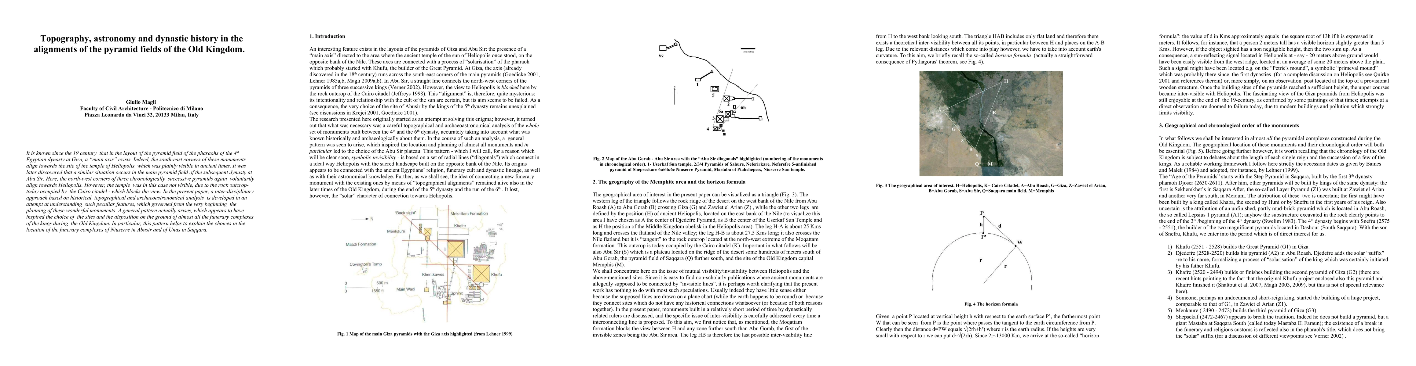 It is known since the 19 century that in the layout of the pyramid field of the pharaohs of the 4 th Egyptian dynasty at Giza, a main axis exists. Indeed, the south-east corners of these monuments align towards the site of the temple of Heliopolis, which was plainly visible in ancient times. It was later discovered that a similar situation occurs in the main pyramid field of the subsequent dynasty at Abu Sir. Here, the northwest corners of three chronologically successive pyramids again voluntarily align towards Heliopolis. However, the temple was in this case not visible, due to the rock outcrop today occupied by the Cairo citadel which blocks the view. In the present paper, a interdisciplinary approach based on historical, topographical and archaeoastronomical analysis is developed in an attempt at understanding such peculiar features, which governed from the very beginning the planning of these wonderful monuments. A general pattern actually arises, which appears to have inspired the choice of the sites and the disposition on the ground of almost all the funerary complexes of the kings during the Old Kingdom. In particular, this pattern helps to explain the choices in the location of the funerary complexes of Niuserre in Abusir and of Unas in Saqqara.