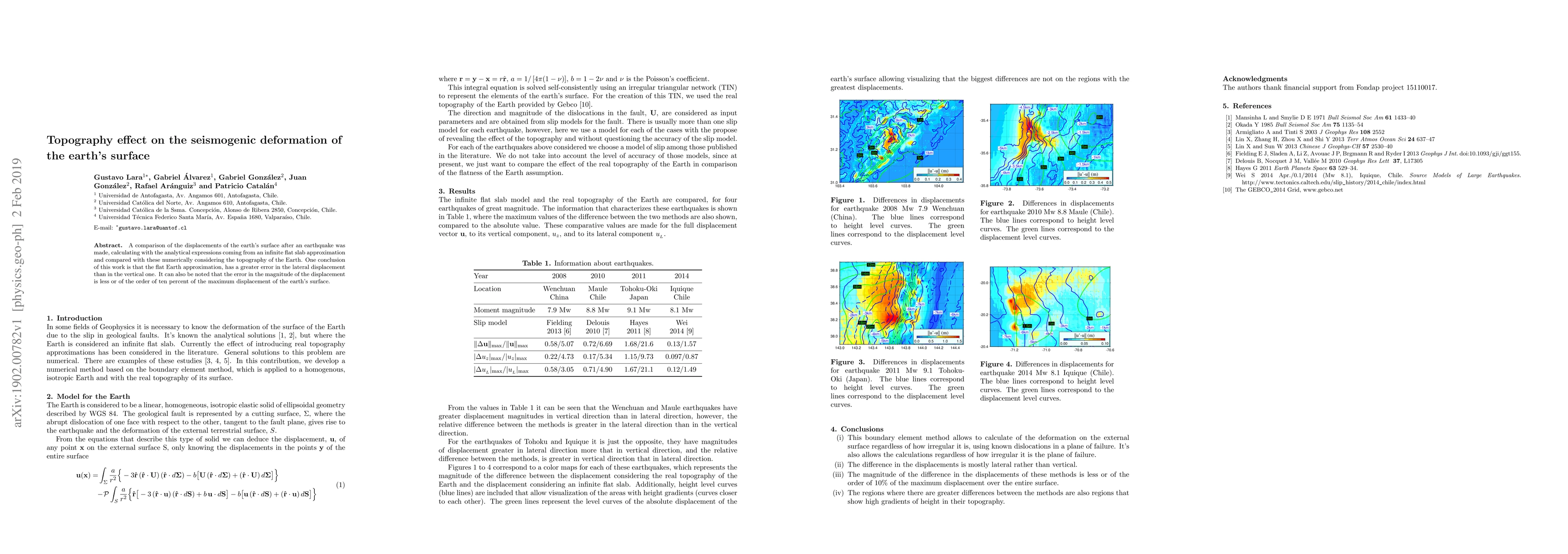 A comparison of the displacements of the earth's surface after an earthquake was made, calculating with the analytical expressions coming from an infinite flat slab approximation and compared with these numerically considering the topography of the Earth. One conclusion of this work is that the flat Earth approximation, has a greater error in the lateral displacement than in the vertical one. It can also be noted that the error in the magnitude of the displacement is less or of the order of ten percent of the maximum displacement of the earth's surface.