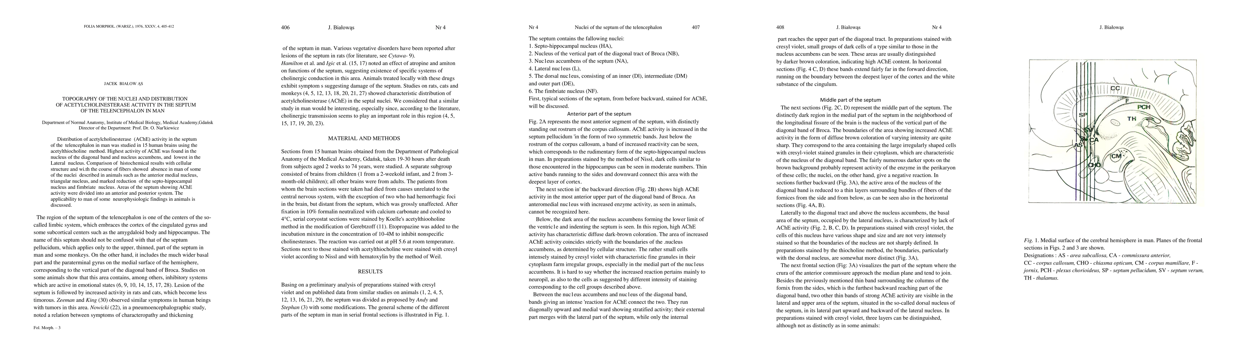 Distribution of acetylcholinesterase (AChE) activity in the septum of the telencephalon in man was studied in 15 human brains using the acetylthiocholine method. Highest activity of AChE was found in the nucleus of the diagonal band and nucleus accumbens, and lowest in the Lateral nucleus. Comparison of histochemical results with cellular structure and wi.th the course of fibers showed absence in man of some of the nuclei described in animals such as the anterior medial nucleus, triangular nucleus, and marked reduction of the septo-hippocampal nucleus and fimbriate nucleus. Areas of the septum showing AChE activity were divided into an anterior and posterior system. The applicability to man of some neurophysiologic findings in animals is discussed.